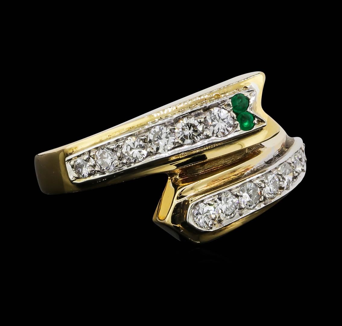 One 14KT Yellow Gold 0.02ctw Emerald and Diamond Ring. Total weight of emerald is 0.02cts. Total weight of diamonds is 0.65cts. Total weight of the ring is 5.29 grams.