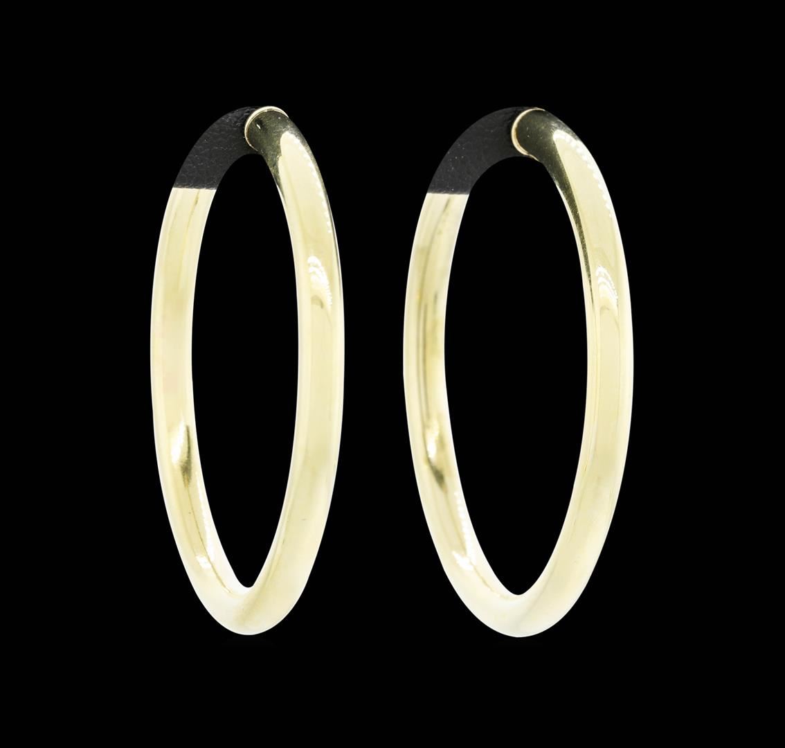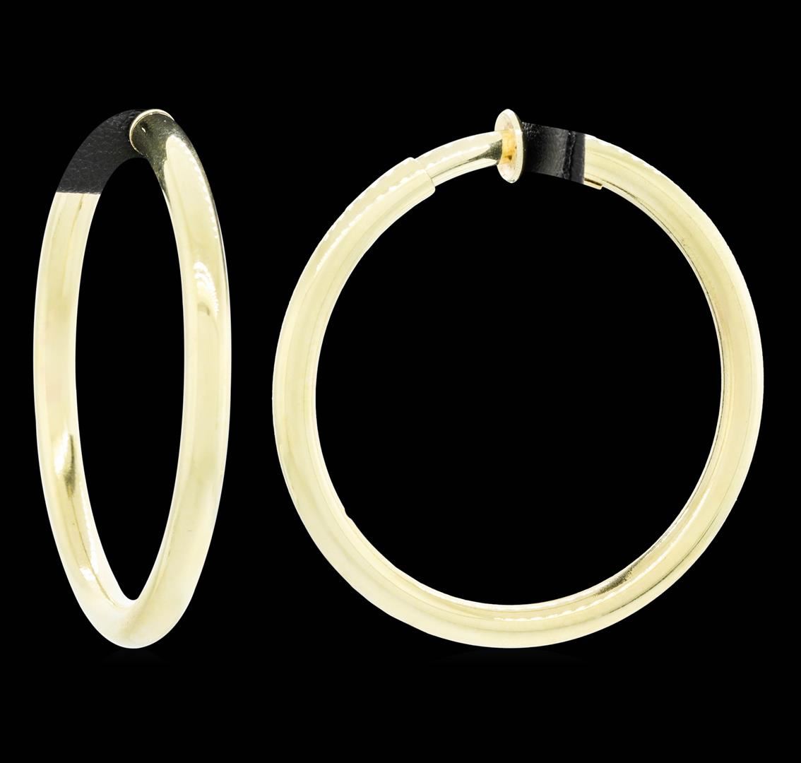 One pair of spring loaded hoop earrings featuring: 14KT yellow gold weighing 12.7 grams. The earrings measure 41.5 millimeters in diameter.