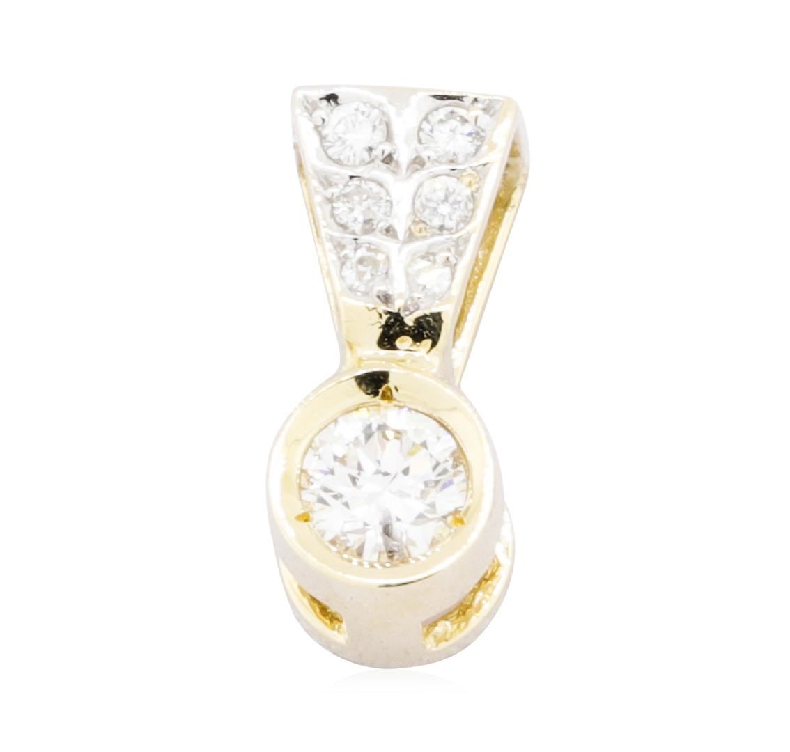 One electronically tested 14KT yellow gold lady's cast fashion pendant with a bright polish finish. The featured lady's pendant has a keyhole motif. Identified with markings of '14K'. Condition is new, good workmanship. Containing: One bezel set round brilliant cut diamond, measuring 4.50 - 4.45 x 2.65mm (depth est.) approximate weight of 0.33ct. Graded in the setting. Color H Clarity SI-2 Cut Very Good Four prong set round brilliant cut diamonds, measuring 1.90 - 1.70 x 1.12mm (depth est.) approximate total weight of 4 Stones = 0.10ct. Graded in the setting. Color H - I Clarity SI-1 to I-1 Cut Good Two prong set single cut diamonds, measuring 1.20 - 1.15 x 0.73mm (depth est.) approximate total weight of 2 Stones = 0.02ct. Graded in the setting. Color H - I Clarity SI-1 to SI-2 Cut Good. Total Weight of Diamonds 0.45ct.. Total Weight of Pendant 1.50gm GAS Appraised.