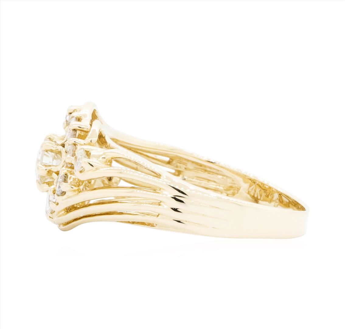 One electronically tested 14KT yellow gold lady's cast fashion ring with a bypass swirl with a bright polish finish. The featured lady's ring has a shank measuring 2.20 millimeters wide. Identified with markings of '14KP'. Condition is used, good workmanship. Containing: One prong set round brilliant cut diamond, measuring 4.15 - 4.10 x 2.53mm (depth est.) approximate weight of 0.26ct. Graded in the setting. Color G - I Clarity I-1 Cut Good Twelve prong set round brilliant cut diamonds, measuring 2.40 - 2.30 x 1.46mm (depth est.) approximate total weight of 12 Stones = 0.60ct. Graded in the setting. Color H - I Clarity SI-1 to SI-2 Cut Good. Total Weight of Diamonds 0.86ct.. Total Weight of Ring 4.20gm GAS Appraised.