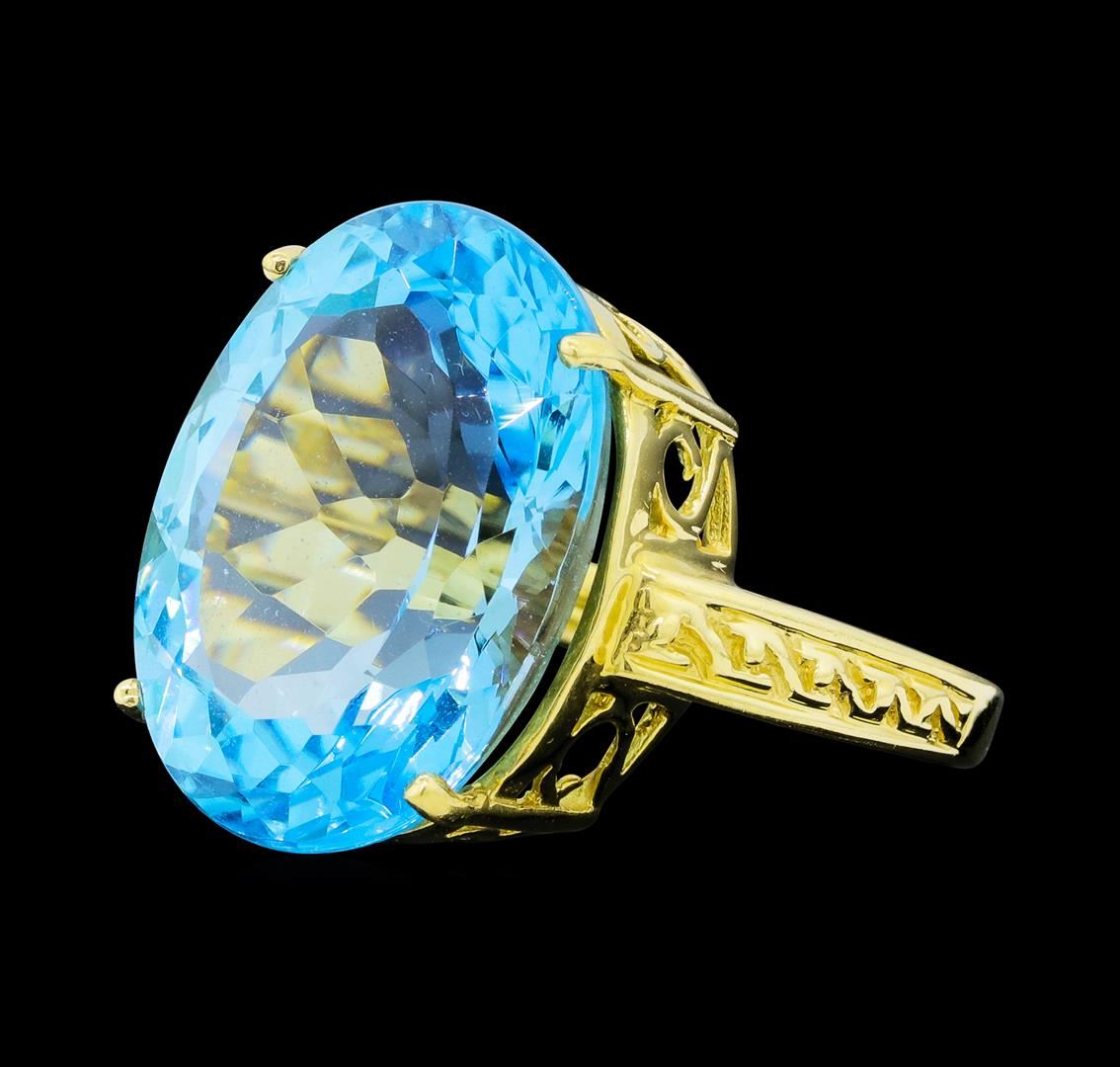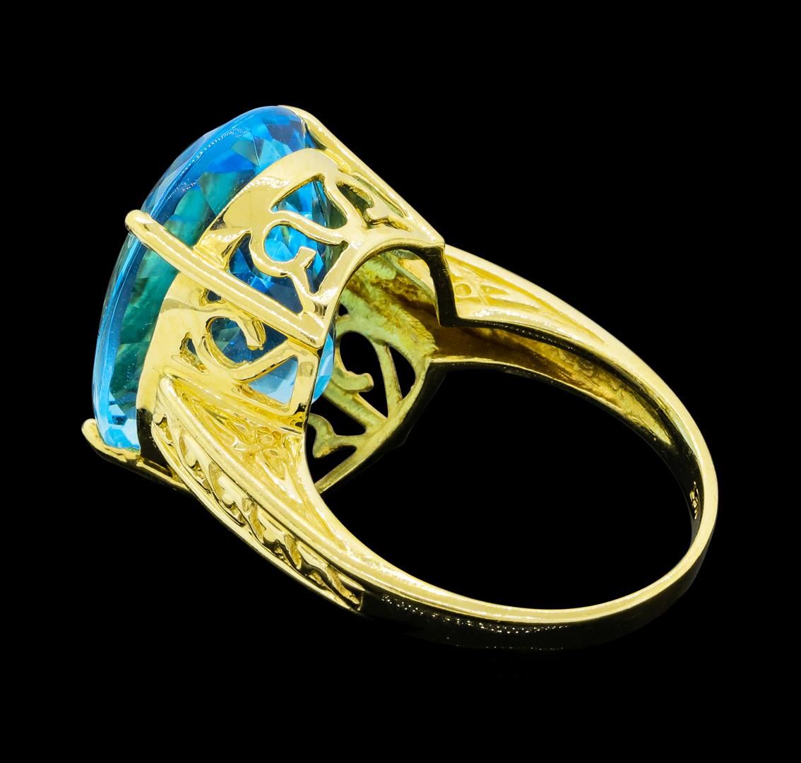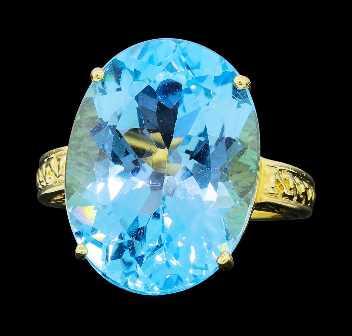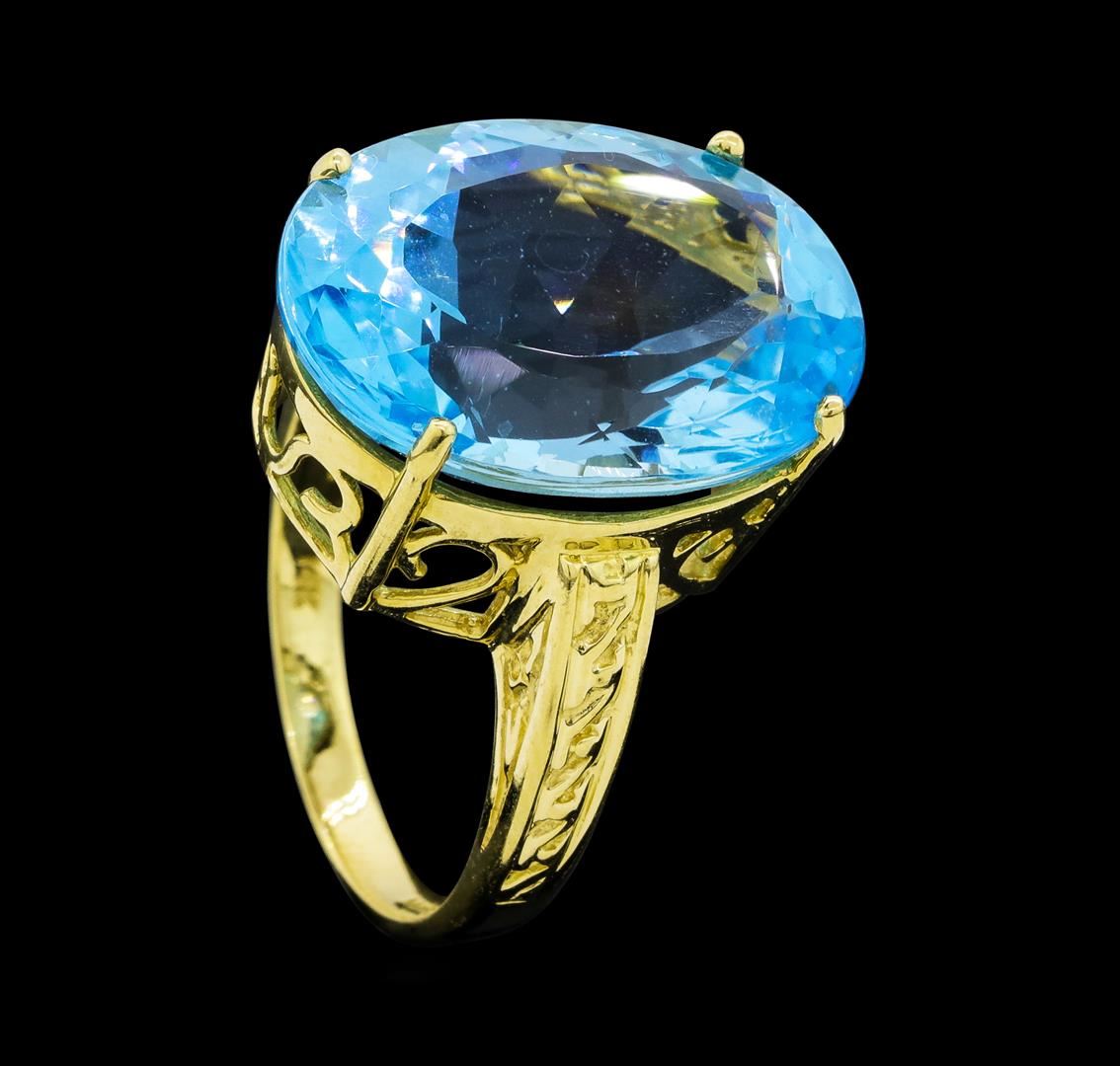 One lady's ring featuring: 14KT yellow gold weighing 9.8 grams containing one blue topaz weighing 22.50ct. The ring is a size 8.5.