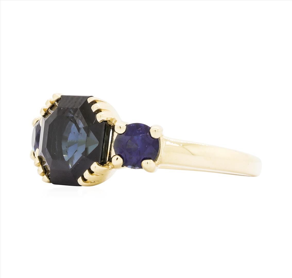 One electronically tested 14KT yellow gold lady's cast three stone straight line ring with a tapered shank with a bright polish finish. The featured lady's ring has a shank measuring 1.63 millimeters wide. Identified with markings of '14K'. Condition is new, good workmanship. Containing: One prong set octagon modified step cut natural blue sapphire, measuring 8.70 x 8.40 x 5.60mm, (depth est.) approximate weight of 4.60ct., clarity is eye clean, dark, moderately strong, blue color, (GIA B 7/4), cut is very good. Transmitting light with no distortion, transparent. Colored gemstones are presumed to have been subjected to commonly used enhancement processes. Graded in the setting. Two prong set round modified mixed cut natural blue sapphires, measuring 4.40 - 4.33 x 2.84 mm, (depth est.) approximate total weight of 0.90ct., clarity is slightly included, medium dark, moderately strong, blue color, (GIA B 6/4), cut is good. Transmitting light with a minimum of distortion, transparent. Colored gemstones are presumed to have been subjected to commonly used enhancement processes. Graded in the setting. Total Weight of Colored Stones 5.50ct.. Total Weight of Ring 4.80gm GAS Appraised.