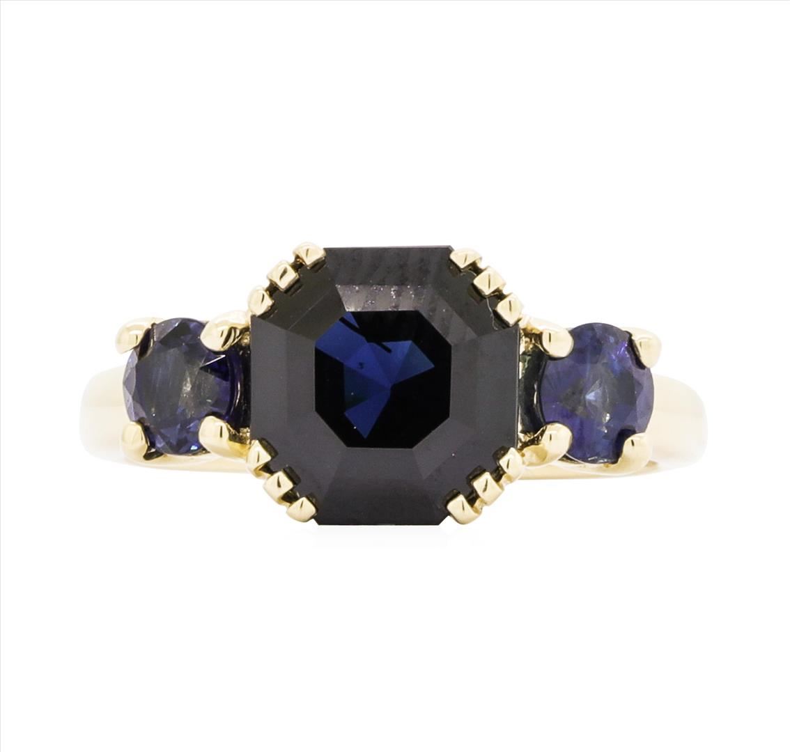 One electronically tested 14KT yellow gold lady's cast three stone straight line ring with a tapered shank with a bright polish finish. The featured lady's ring has a shank measuring 1.63 millimeters wide. Identified with markings of '14K'. Condition is new, good workmanship. Containing: One prong set octagon modified step cut natural blue sapphire, measuring 8.70 x 8.40 x 5.60mm, (depth est.) approximate weight of 4.60ct., clarity is eye clean, dark, moderately strong, blue color, (GIA B 7/4), cut is very good. Transmitting light with no distortion, transparent. Colored gemstones are presumed to have been subjected to commonly used enhancement processes. Graded in the setting. Two prong set round modified mixed cut natural blue sapphires, measuring 4.40 - 4.33 x 2.84 mm, (depth est.) approximate total weight of 0.90ct., clarity is slightly included, medium dark, moderately strong, blue color, (GIA B 6/4), cut is good. Transmitting light with a minimum of distortion, transparent. Colored gemstones are presumed to have been subjected to commonly used enhancement processes. Graded in the setting. Total Weight of Colored Stones 5.50ct.. Total Weight of Ring 4.80gm GAS Appraised.