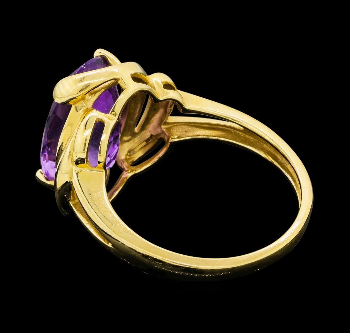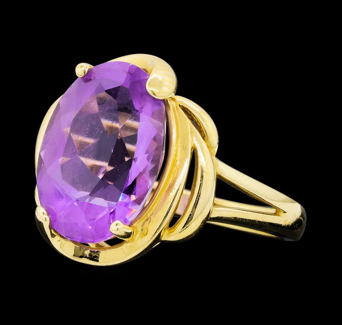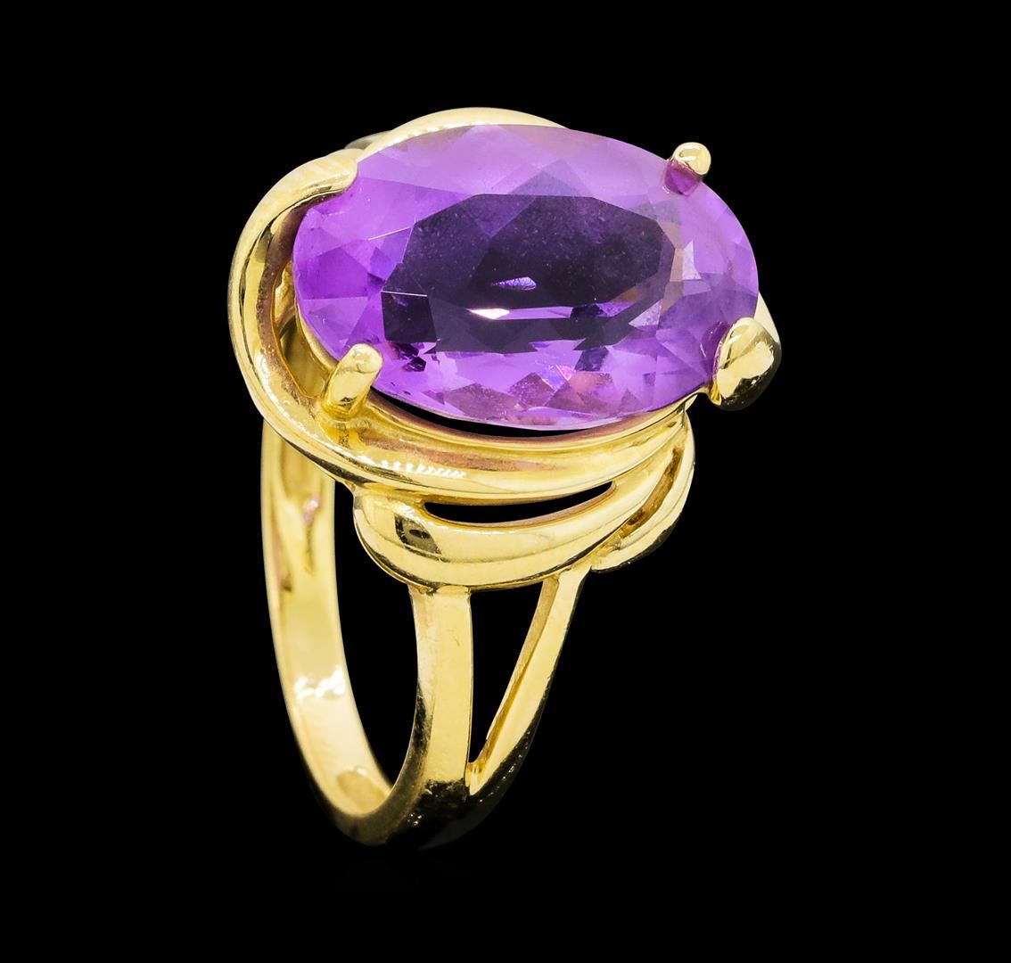 One lady's ring featuring: 14KT yellow gold weighing 5.1 grams containing one amethyst weighing 7.00ct. The ring is a size 8.