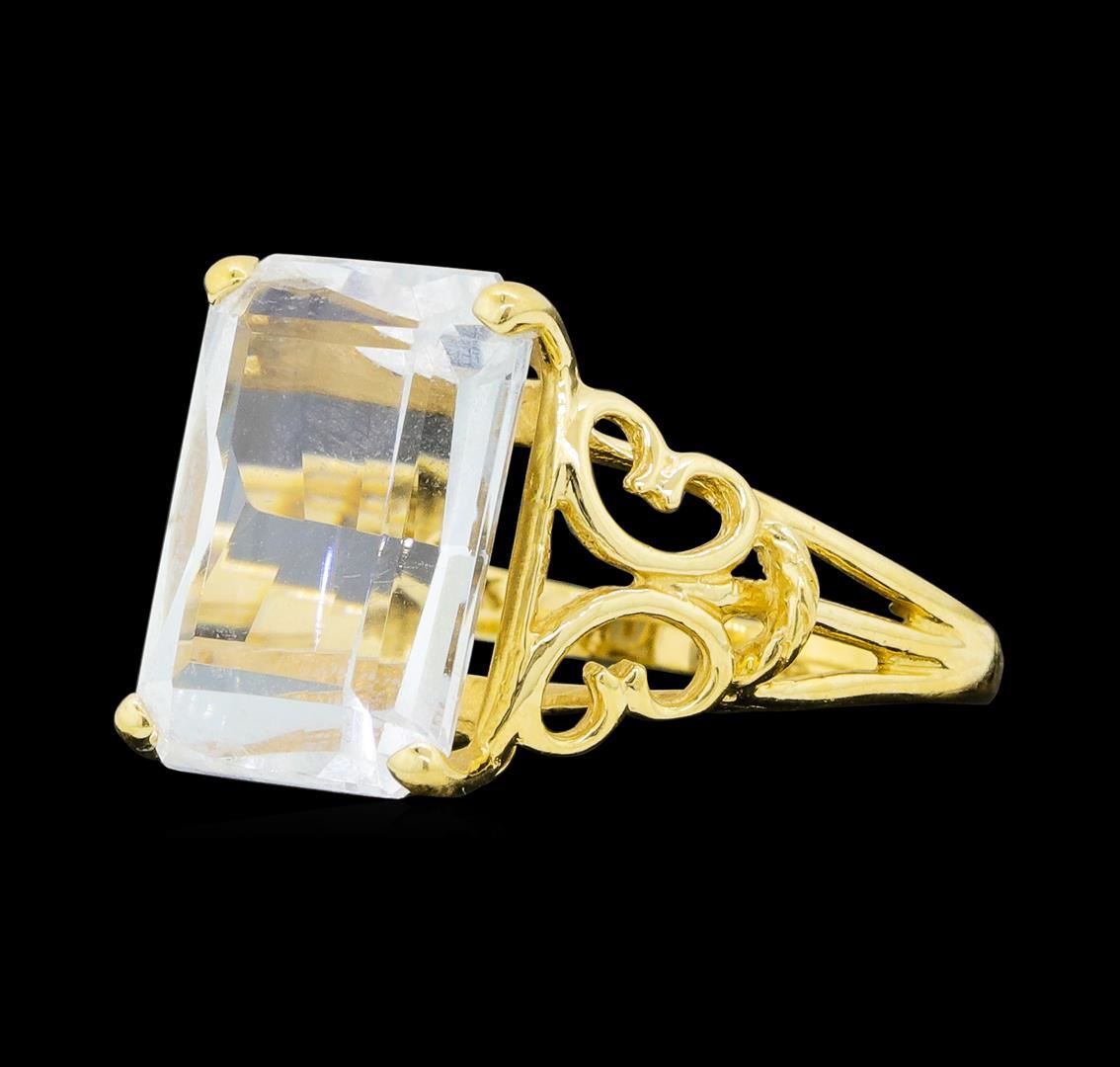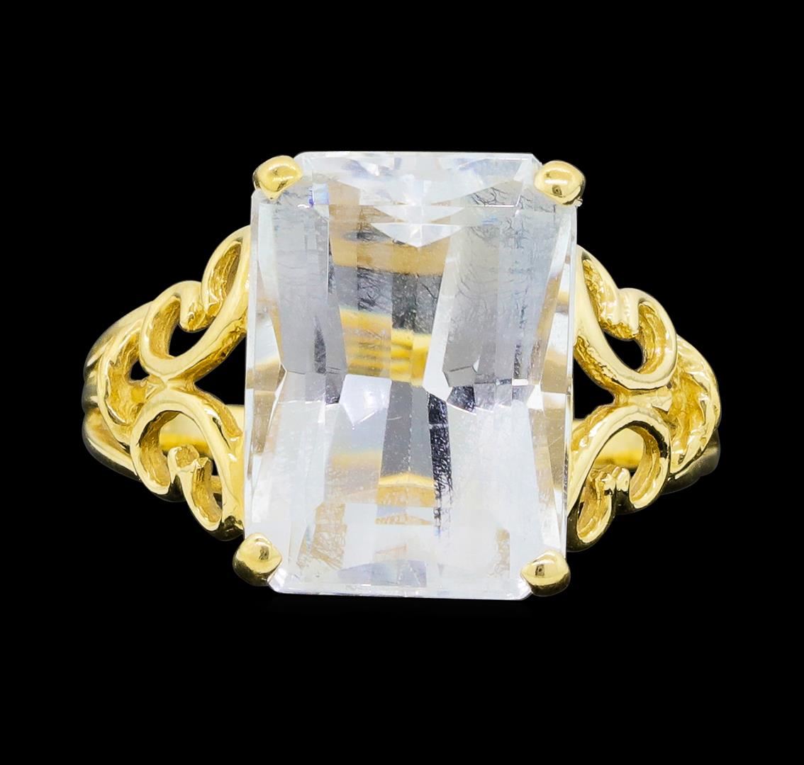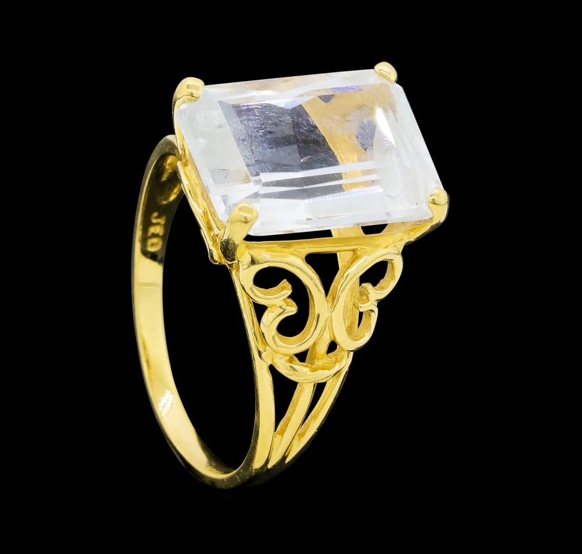 One lady's ring featuring: 14KT yellow gold weighing 4.7 grams containing one emerald cut very light blue topaz weighing 9.50ct. The ring is a size 8.