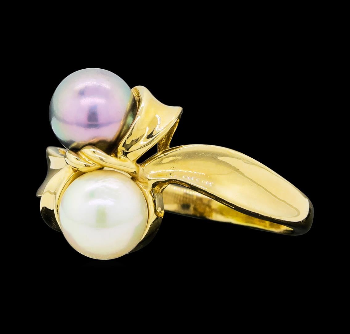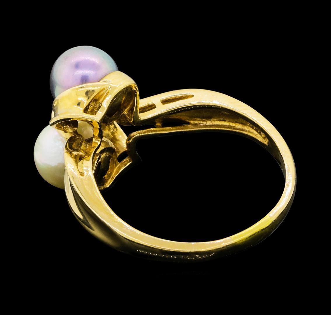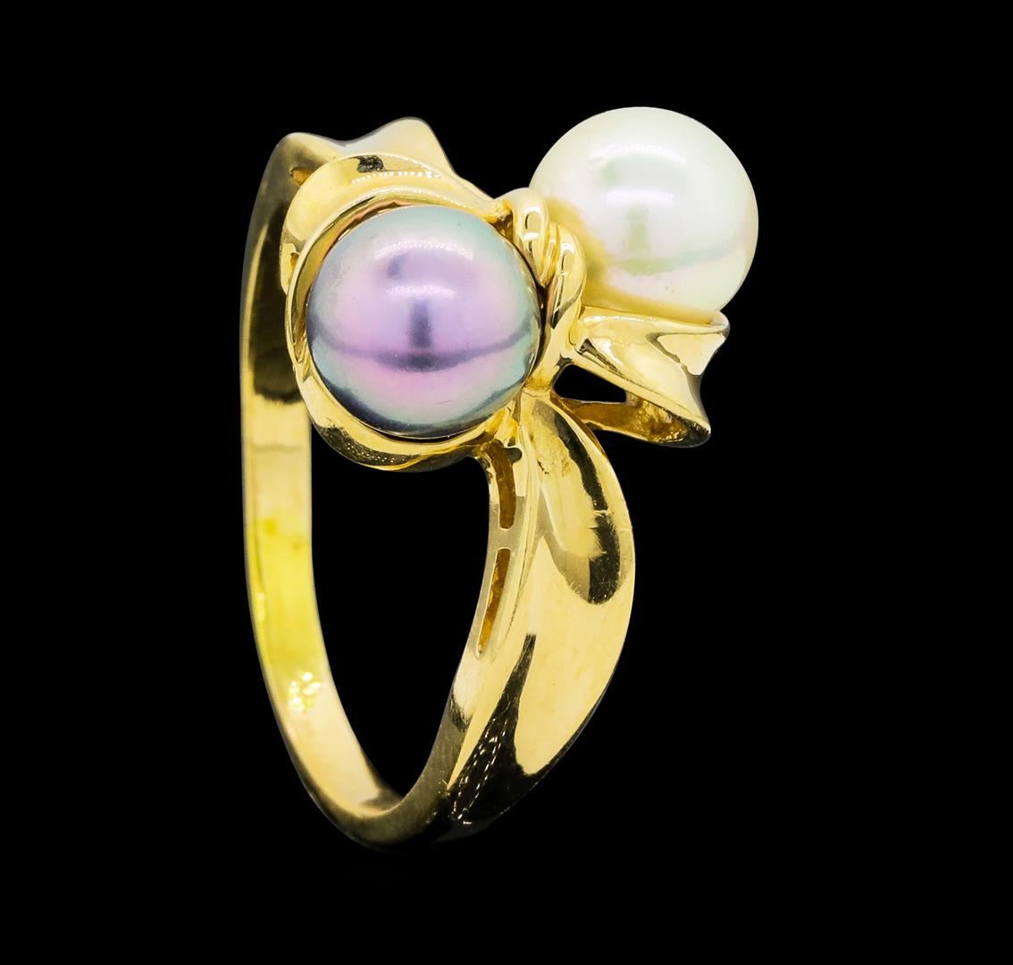 One lady's black and white pearl ring featuring: 14KT yellow gold weighing 5.8 grams containing one 7.5mm black pearl and one 7.5mm white pearl. The ring is a size 9.