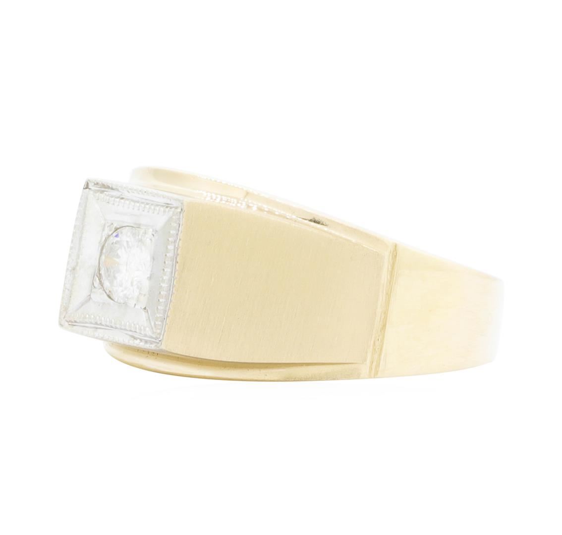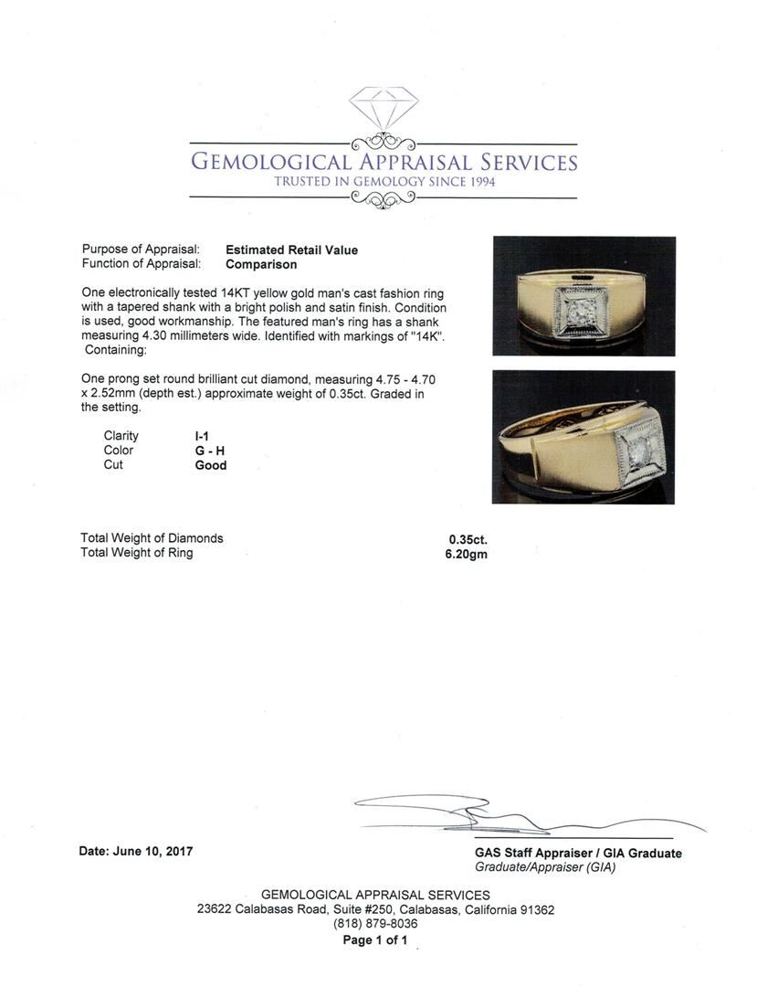 One electronically tested 14KT yellow gold man's cast fashion ring with a tapered shank with a bright polish and satin finish. The featured man's ring has a shank measuring 4.30 millimeters wide. Identified with markings of '14K'. Condition is used, good workmanship. Containing: One prong set round brilliant cut diamond, measuring 4.75 - 4.70 x 2.52mm (depth est.) approximate weight of 0.35ct. Graded in the setting. Color G - H Clarity I-1 Cut Good. Total Weight of Diamonds 0.35ct.. Total Weight of Ring 6.20gm GAS Appraised.