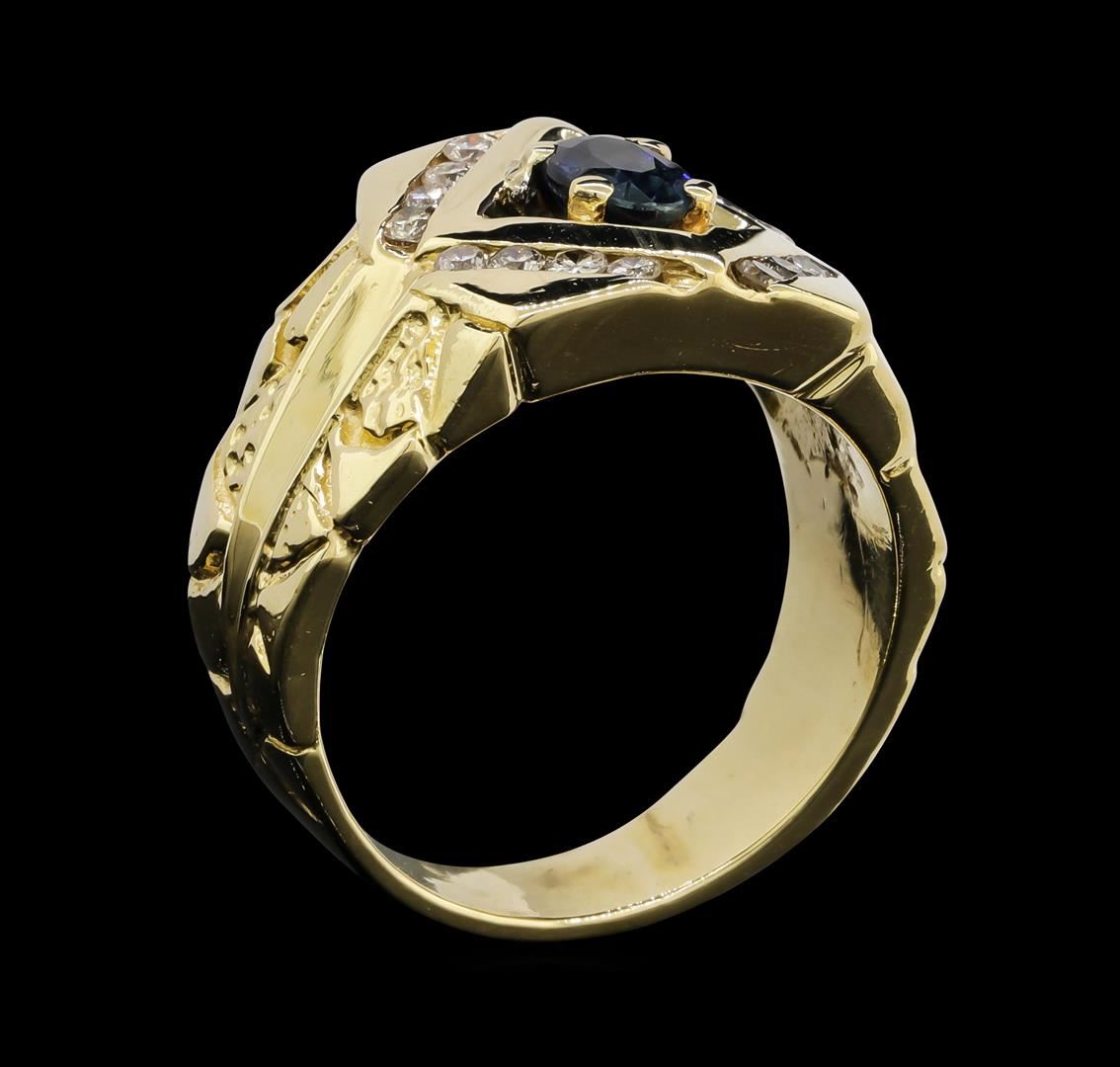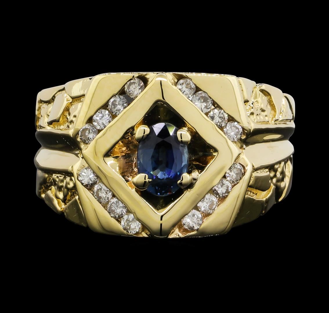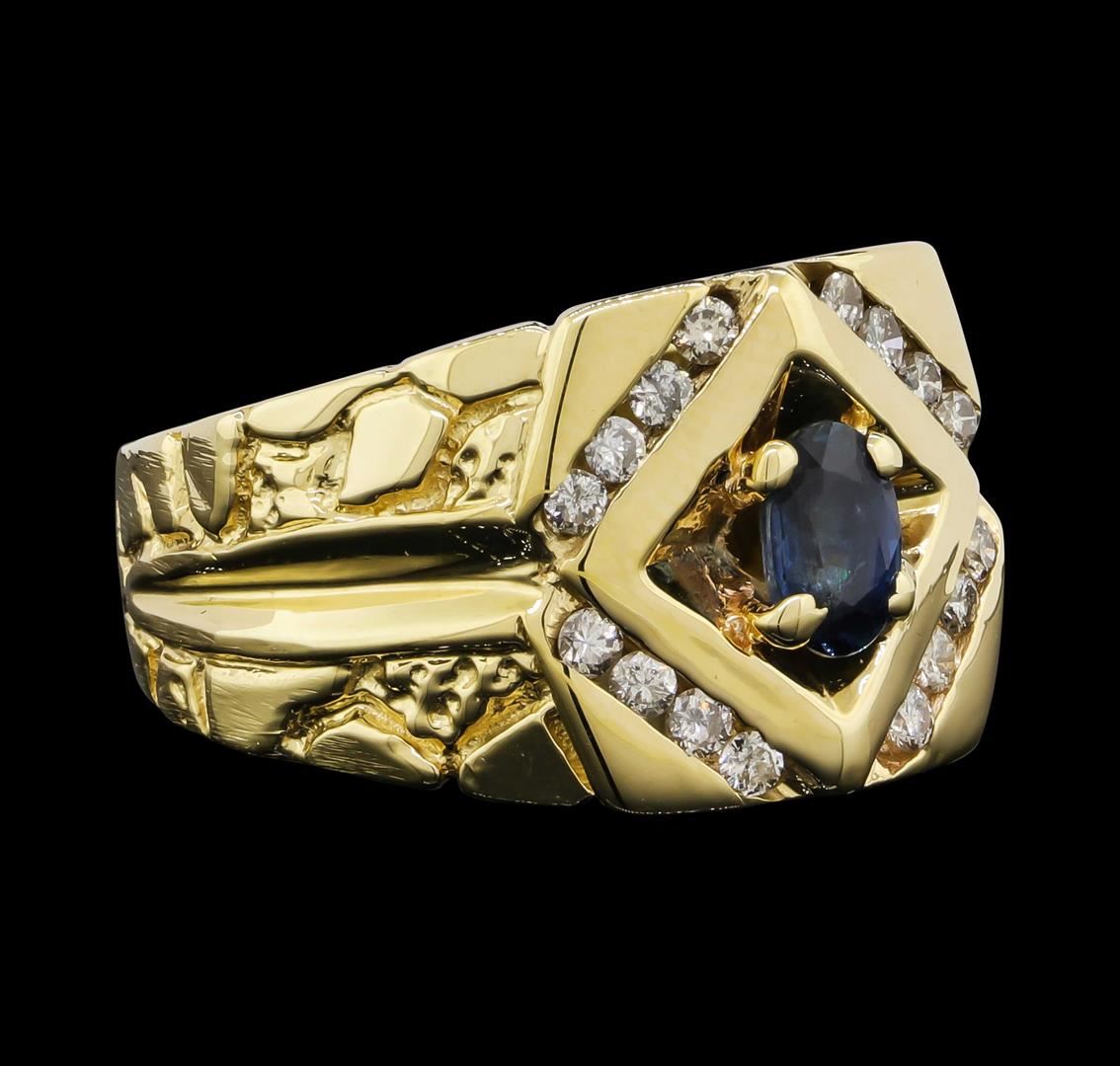 One men's ring featuring: 14KT yellow gold weighing 11.2 grams containing one center sapphire weighing 0.70ct and diamonds weighing 0.40ctw.