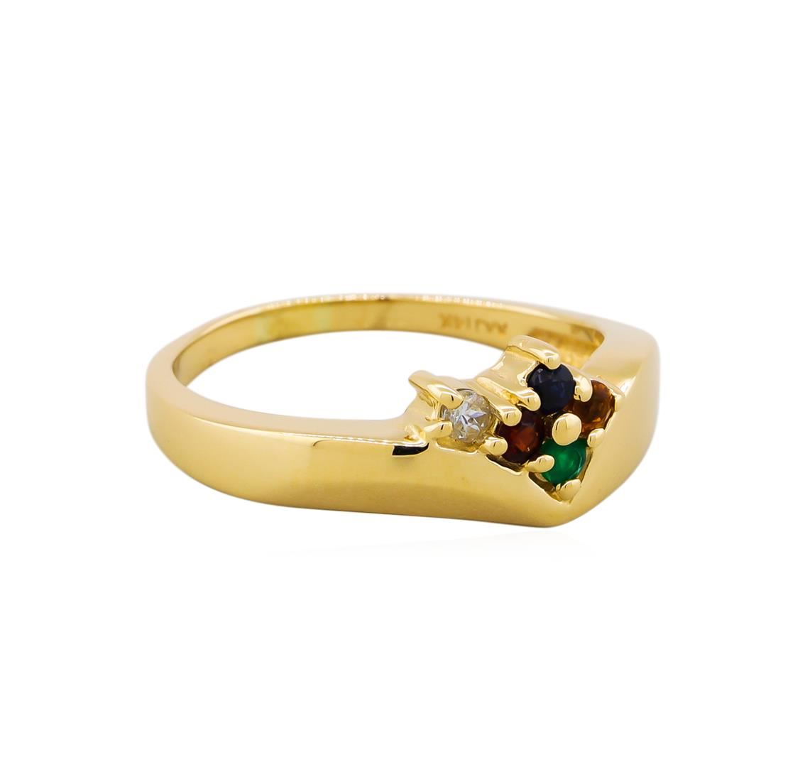 This ring is made of 14KT Yellow Gold weighing approximately 3.55 grams with markings of "14K" on the inside of the band. There is approximately 0.05ctw of multi colored gemstones with one diamond. The ring is a size 6.5.