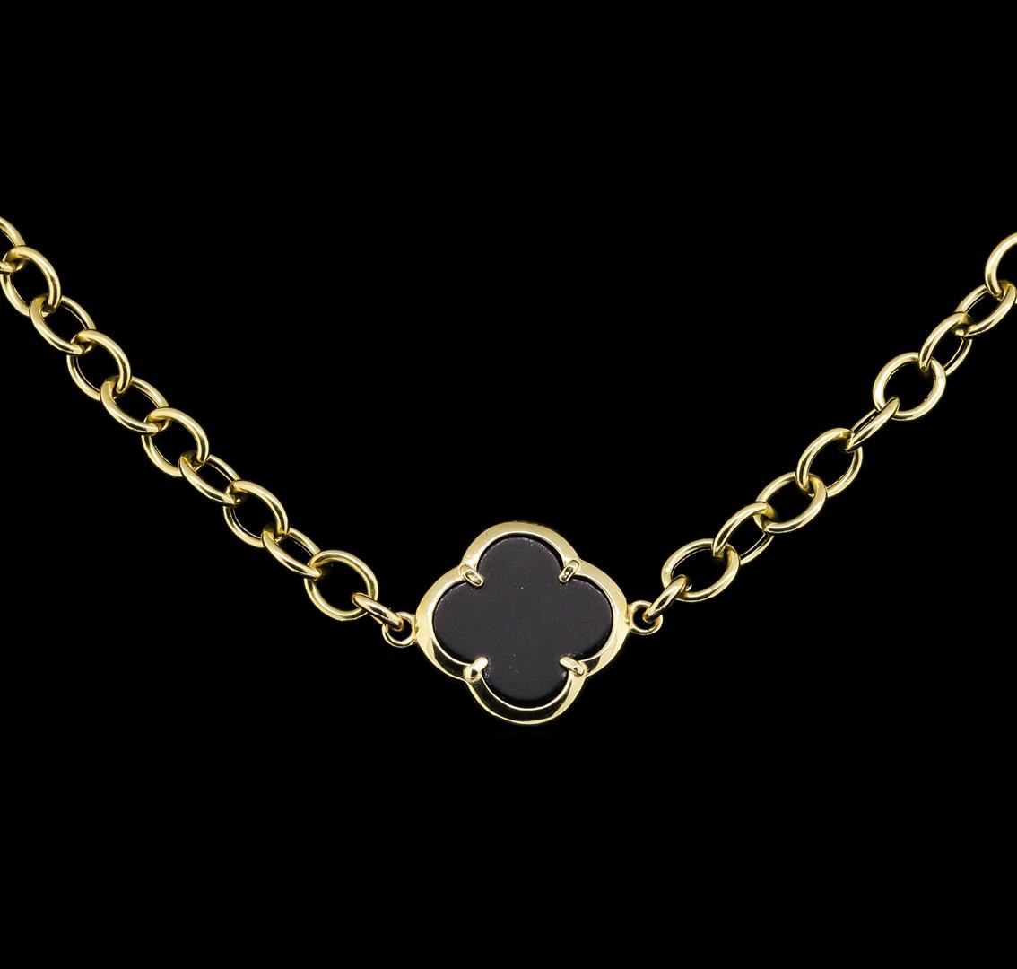One 14KT Yellow Gold Onyx Necklace. Total weight of the necklace is 13.77 grams.