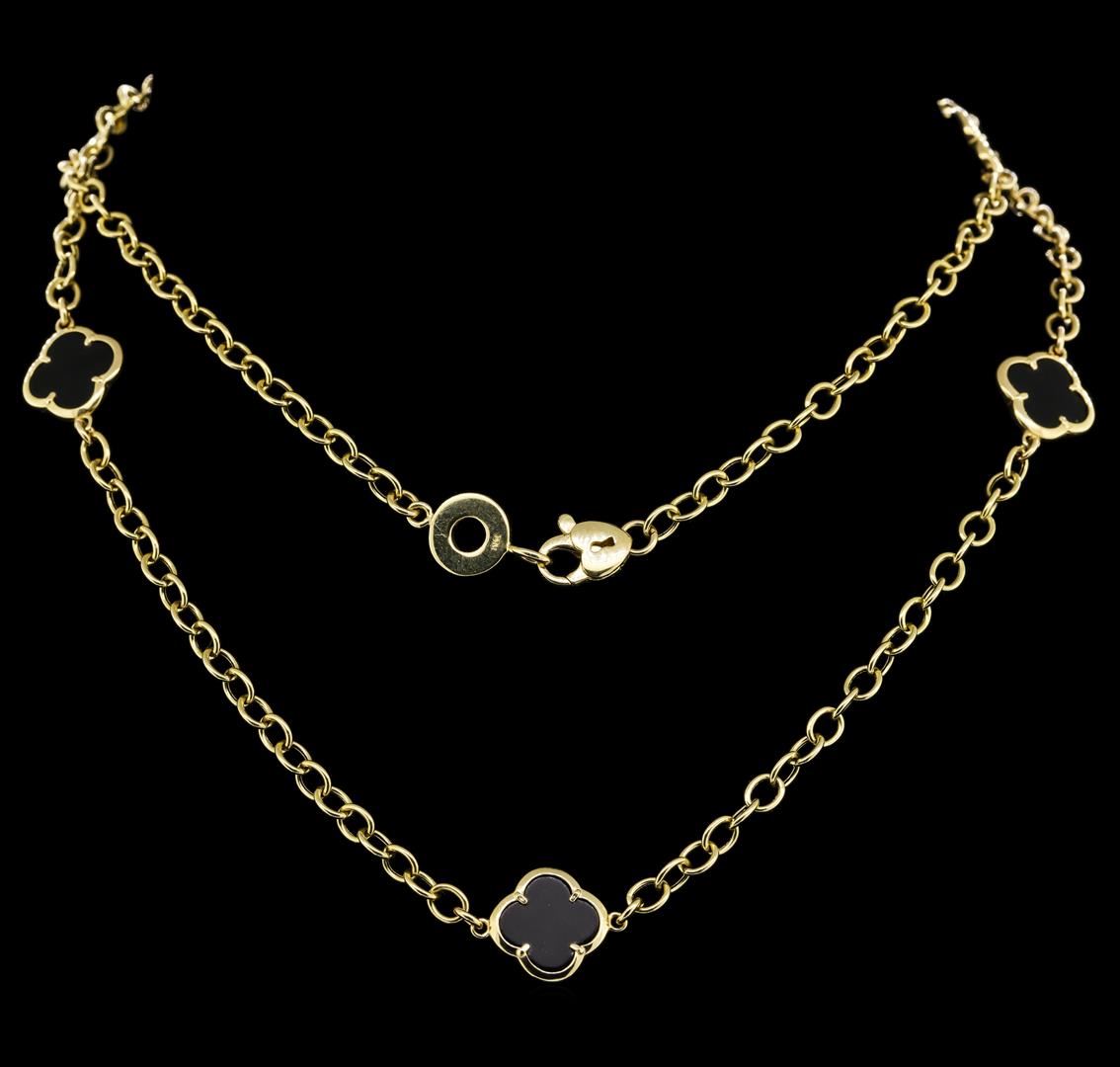 One 14KT Yellow Gold Onyx Necklace. Total weight of the necklace is 13.77 grams.