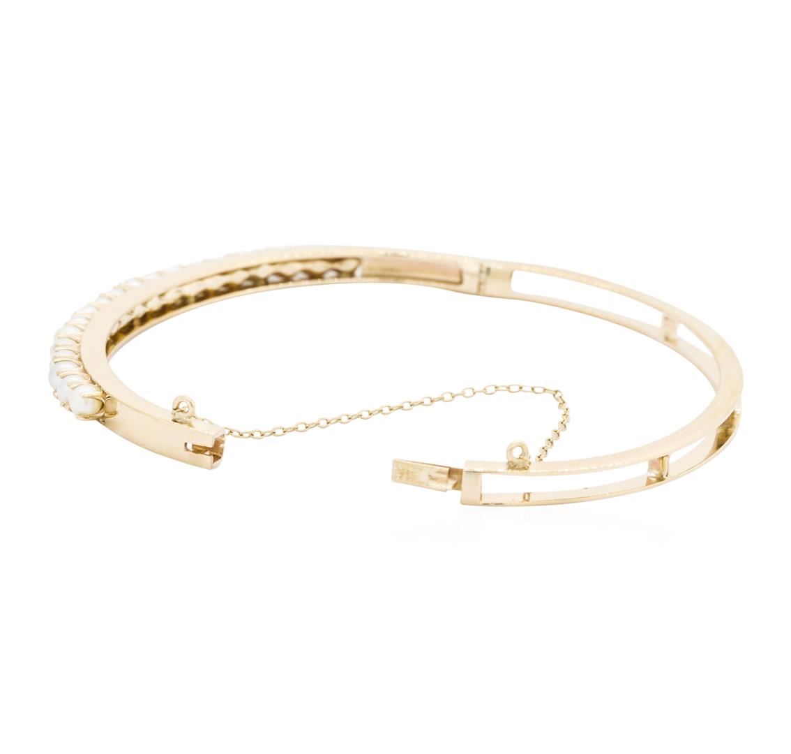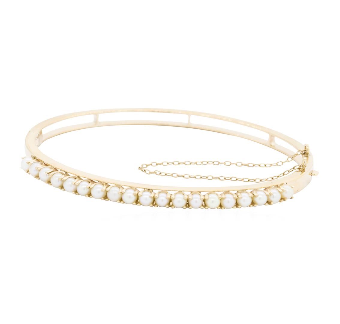 One lady's bangle bracelet featuring: 14KT yellow gold weighing 10.9 grams containing nineteen 3mm round pearls. The bracelet has an attached safety chain and measures approximately seven inches in circumference.