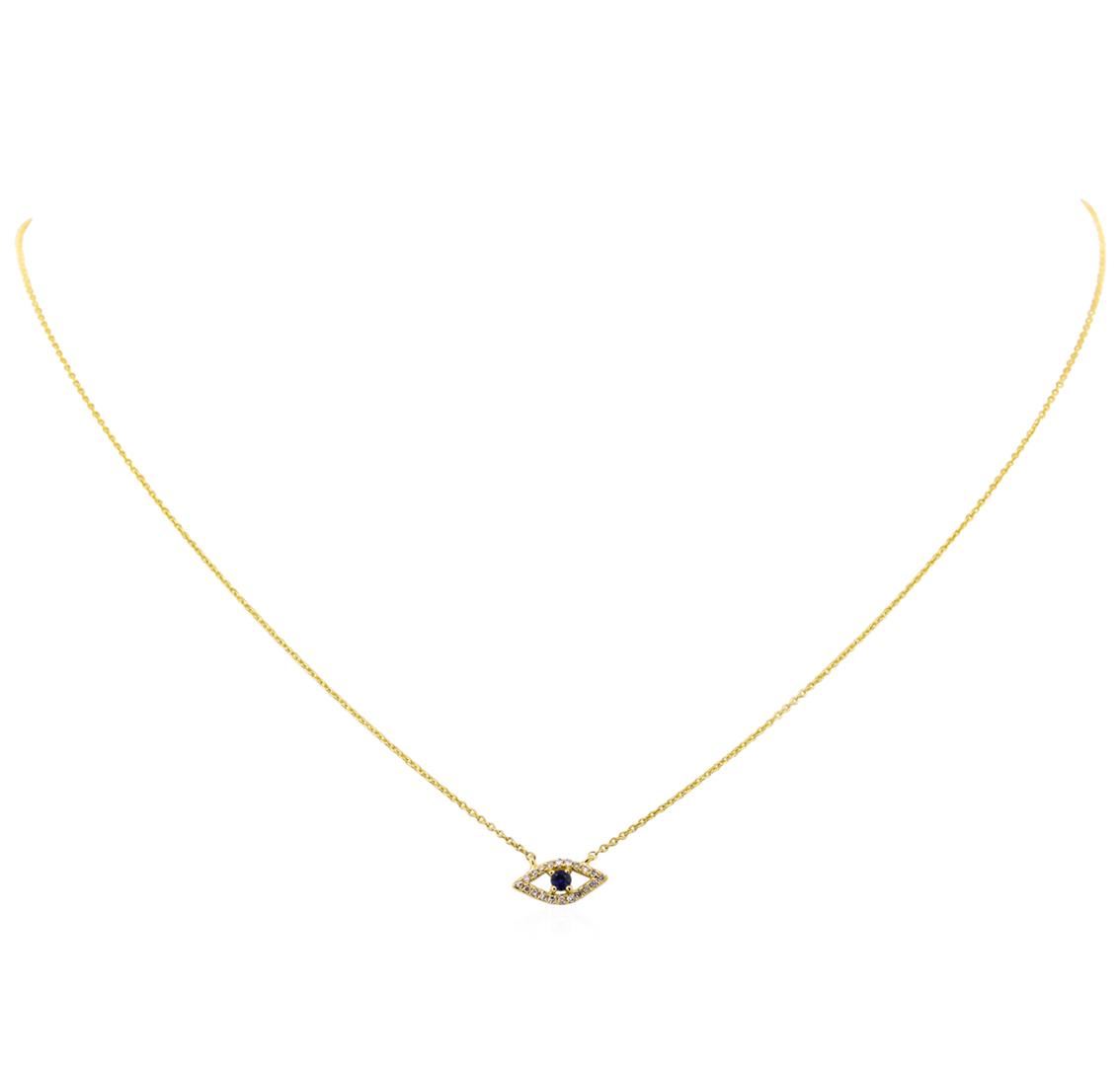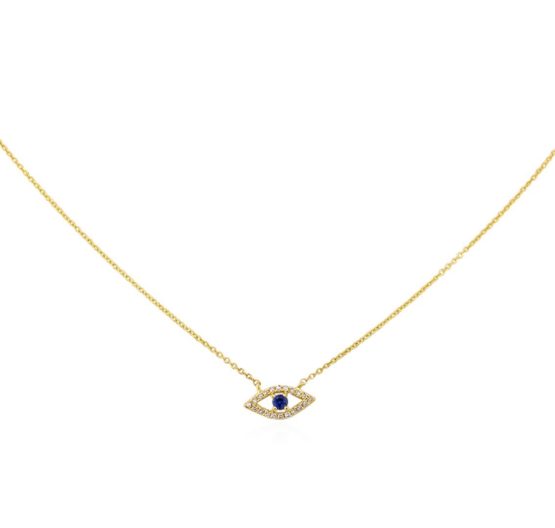 This necklace is made of 14KT Yellow Gold weighing approximately 1.60 grams. The necklace has an "eye" shaped pendant in the middle of the chain containing one round cut blue sapphire weighing approximately .08cts, and also contains twenty round cut diamonds with a total approximate weight of .09ctw. The length of the necklace is approximately 18" long.