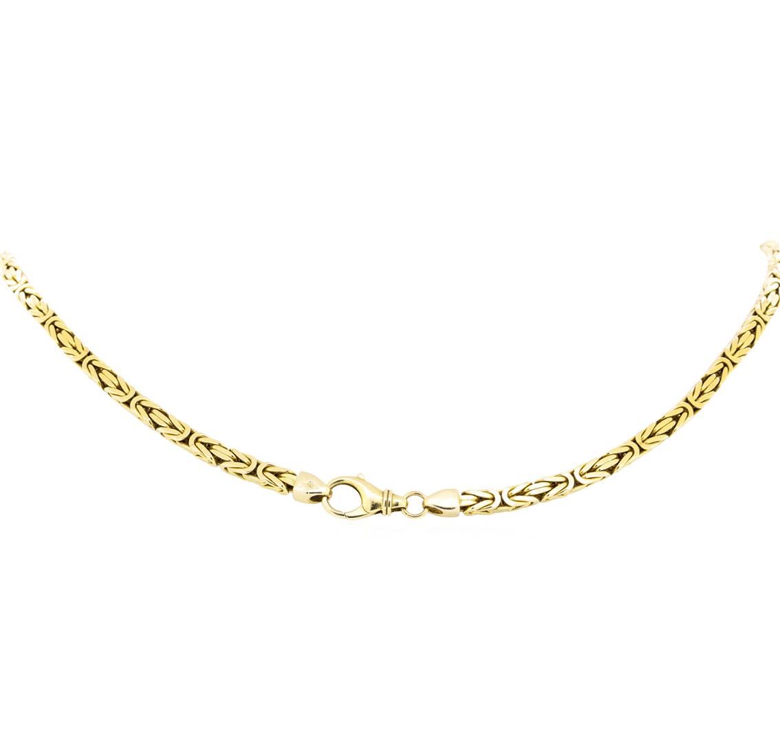 One square byzantine chain measuring 24 inches in length and 4.6 millimeters in width with a lobster claw clasp featuring: 14KT yellow gold weighing 94.1 grams.