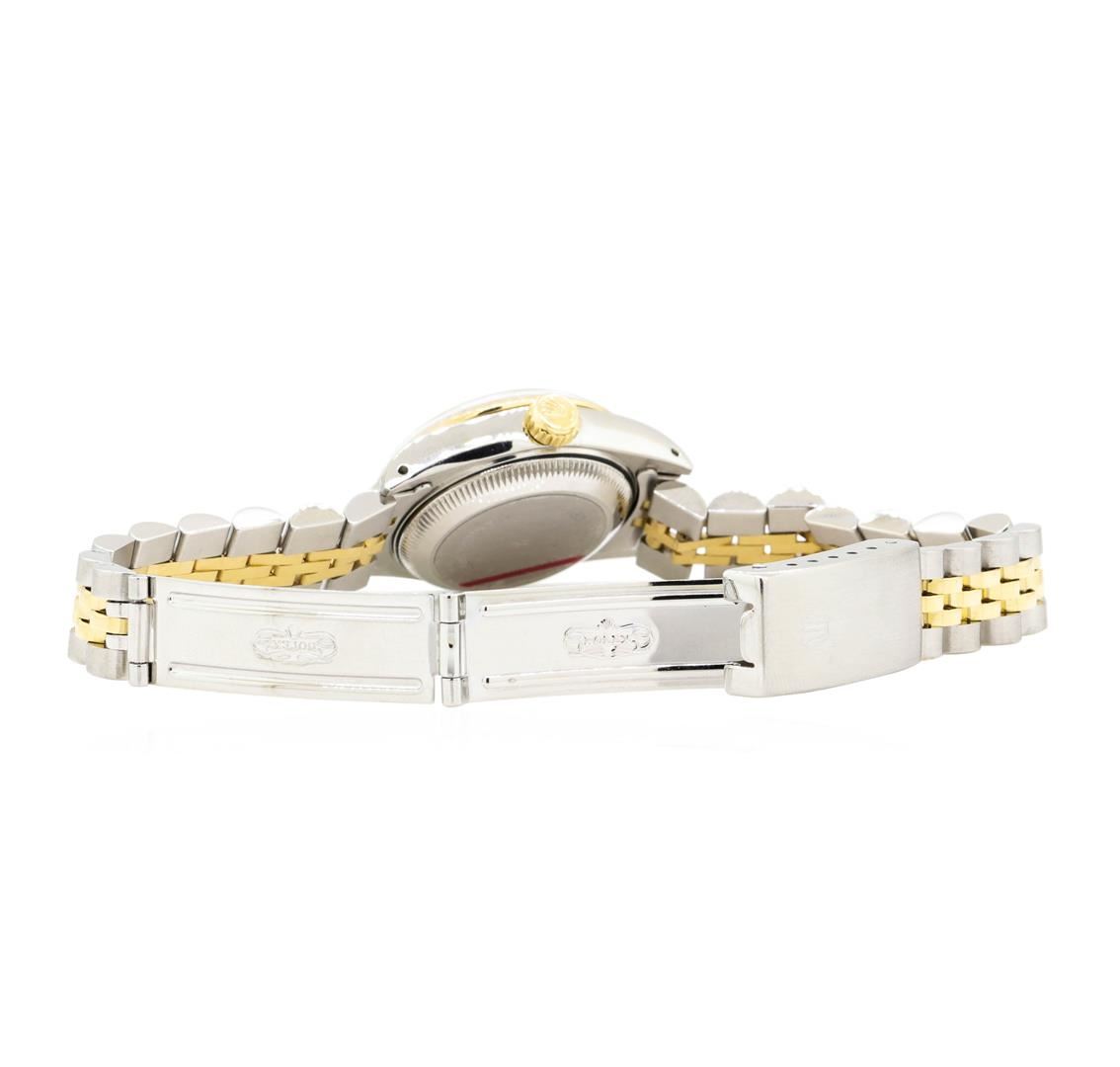 One Ladies, hand crafted and machine milled Rolex Oyster perpetual datejust wrist watch electronically tested gold and stainless steel, Serial#: 8519627, Crown: 14KT yellow gold screw-down, Bezel: gold fluted, Crystal: custom synthetic sapphire with cyclops lens, Movement: superlative chronometer, Dial: black with gold accents with baton, narrow type hands and diamond marker numerals, Circa: 1984, Calendar: date window at 3 o'clock, quickset, Bracelet: two-tone jubilee, Condition: G-5 fine. The watch bracelet is adjustable and measures approximately six and a half inches in length. Containing: Ten prong set single cut diamonds, measuring 1.50 - 1.50 x 0.93mm (depth est.) approximate total weight of 10 Stones = 0.13ct. Graded in the setting. Color G - H Clarity VS-1 to VS-2 Cut Very Good. Total Weight of Diamonds 0.13ct.. Total Weight of Watch 54.30gm. GAS Appraised.