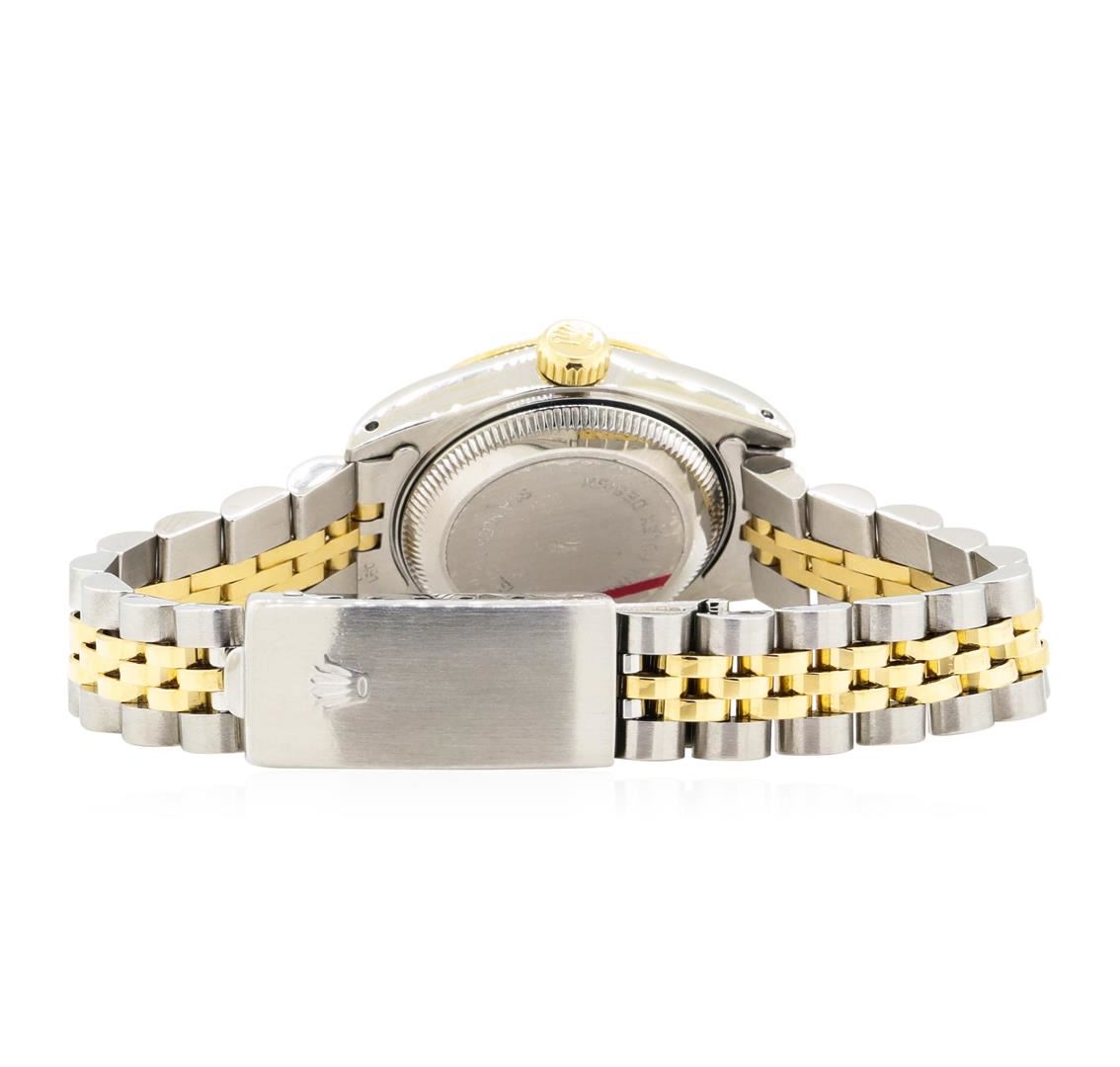 One Ladies, hand crafted and machine milled Rolex Oyster perpetual datejust wrist watch electronically tested gold and stainless steel, Serial#: 8519627, Crown: 14KT yellow gold screw-down, Bezel: gold fluted, Crystal: custom synthetic sapphire with cyclops lens, Movement: superlative chronometer, Dial: black with gold accents with baton, narrow type hands and diamond marker numerals, Circa: 1984, Calendar: date window at 3 o'clock, quickset, Bracelet: two-tone jubilee, Condition: G-5 fine. The watch bracelet is adjustable and measures approximately six and a half inches in length. Containing: Ten prong set single cut diamonds, measuring 1.50 - 1.50 x 0.93mm (depth est.) approximate total weight of 10 Stones = 0.13ct. Graded in the setting. Color G - H Clarity VS-1 to VS-2 Cut Very Good. Total Weight of Diamonds 0.13ct.. Total Weight of Watch 54.30gm. GAS Appraised.