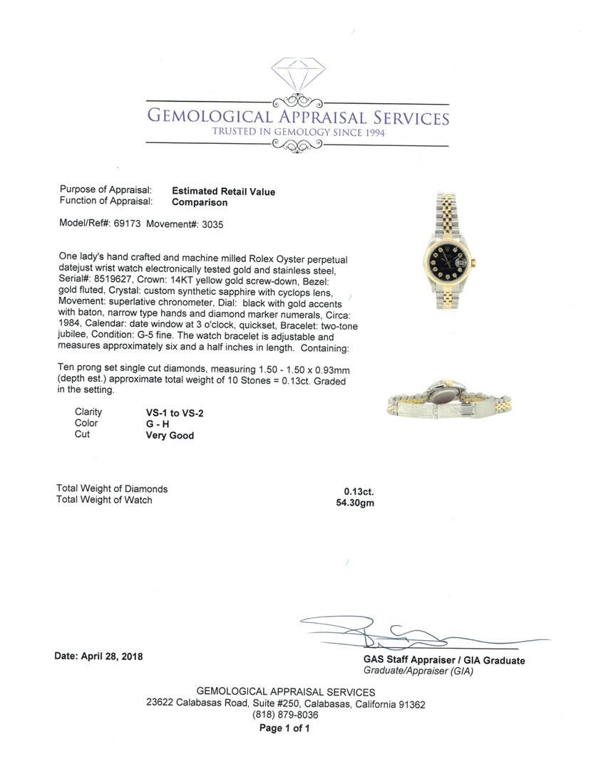One Ladies, hand crafted and machine milled Rolex Oyster perpetual datejust wrist watch electronically tested gold and stainless steel, Serial#: 8519627, Crown: 14KT yellow gold screw-down, Bezel: gold fluted, Crystal: custom synthetic sapphire with cyclops lens, Movement: superlative chronometer, Dial: black with gold accents with baton, narrow type hands and diamond marker numerals, Circa: 1984, Calendar: date window at 3 o'clock, quickset, Bracelet: two-tone jubilee, Condition: G-5 fine. The watch bracelet is adjustable and measures approximately six and a half inches in length. Containing: Ten prong set single cut diamonds, measuring 1.50 - 1.50 x 0.93mm (depth est.) approximate total weight of 10 Stones = 0.13ct. Graded in the setting. Color G - H Clarity VS-1 to VS-2 Cut Very Good. Total Weight of Diamonds 0.13ct.. Total Weight of Watch 54.30gm. GAS Appraised.