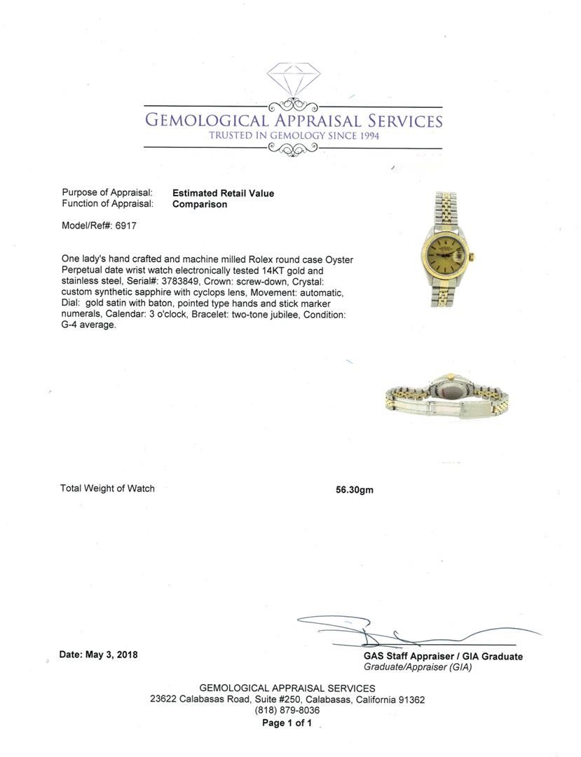 One Ladies, hand crafted and machine milled Rolex round case Oyster Perpetual date wrist watch electronically tested 14KT gold and stainless steel, Serial#: 3783849, Crown: screw-down, Crystal: custom synthetic sapphire with cyclops lens, Movement: automatic, Dial: gold satin with baton, pointed type hands and stick marker numerals, Calendar: 3 o'clock, Bracelet: two-tone jubilee, Condition: G-4 average.. Total Weight of Watch 56.30gm. GAS Appraised.