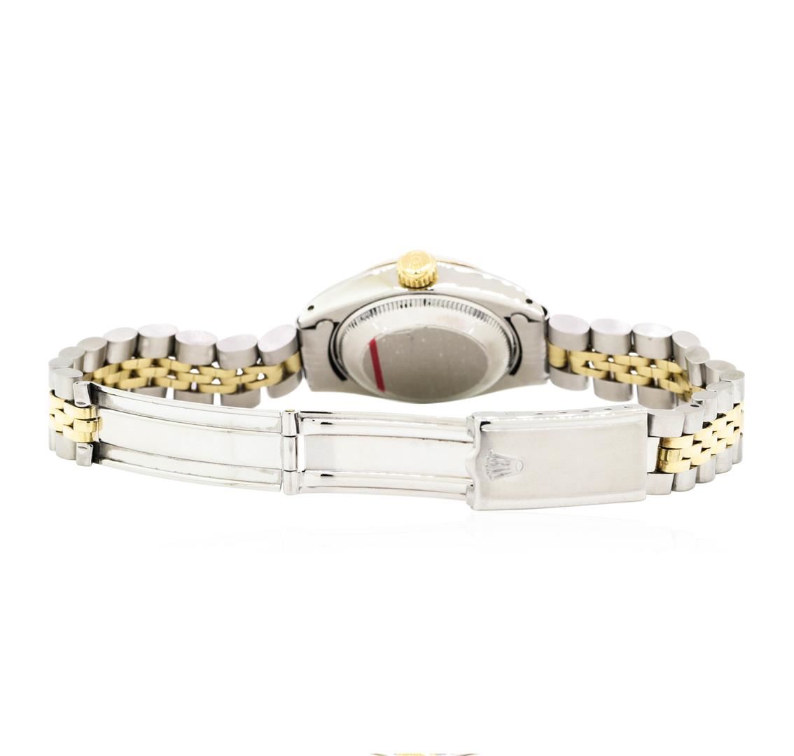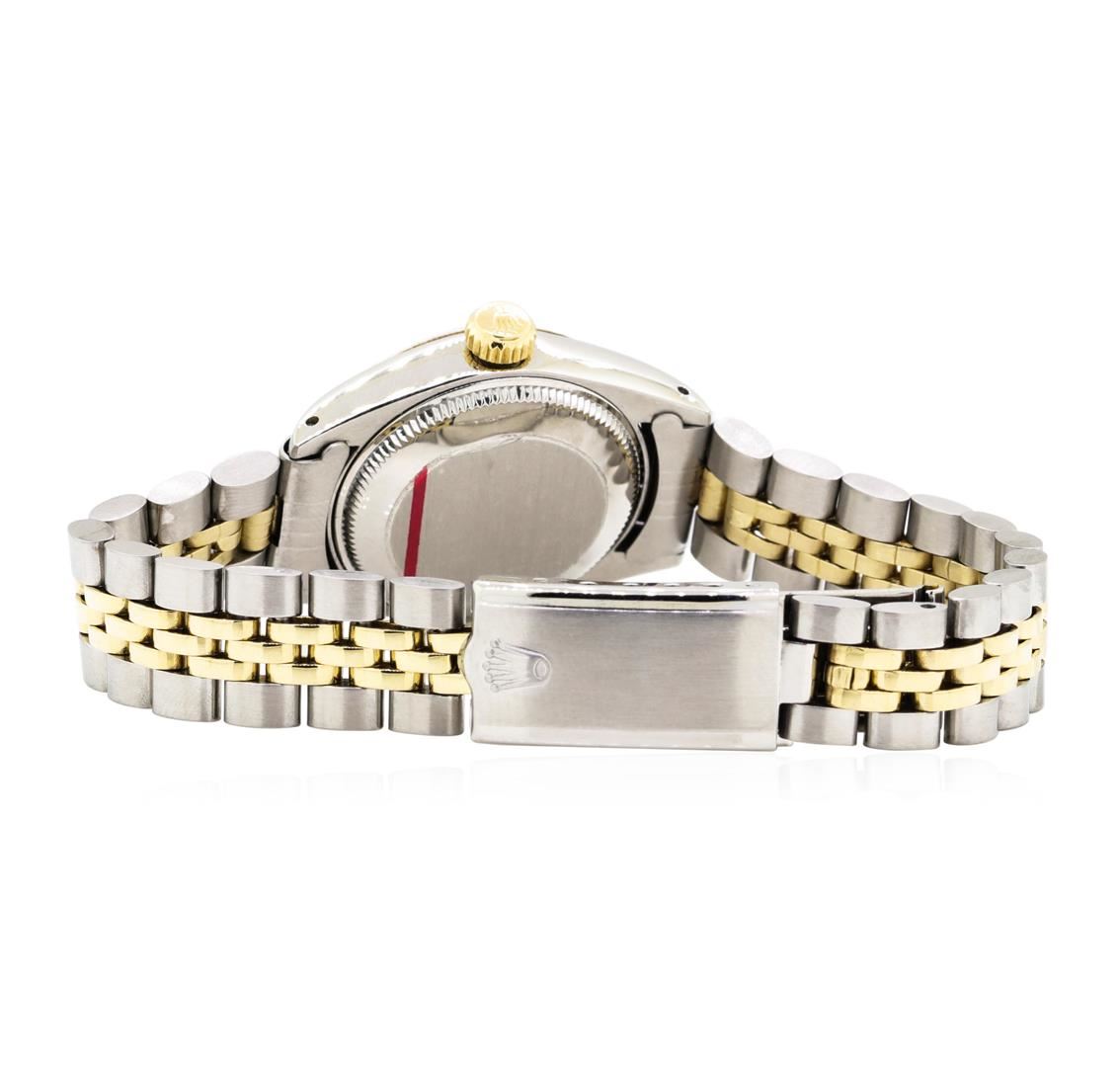 One Ladies, hand crafted and machine milled Rolex round case Oyster Perpetual date wrist watch electronically tested 14KT gold and stainless steel, Serial#: 3783849, Crown: screw-down, Crystal: custom synthetic sapphire with cyclops lens, Movement: automatic, Dial: gold satin with baton, pointed type hands and stick marker numerals, Calendar: 3 o'clock, Bracelet: two-tone jubilee, Condition: G-4 average.. Total Weight of Watch 56.30gm. GAS Appraised.