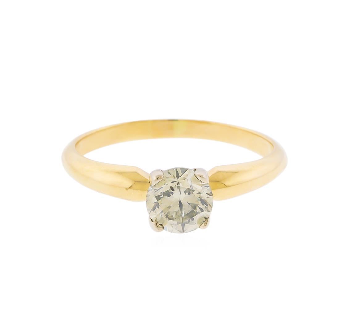 One electronically tested 14KT yellow and white gold ladies cast & assembled diamond solitaire ring. The ring is completed by a one and one-half millimeter wide band. Bright polish finish. Identified with markings of "14K". Condition is new, good workmanship. Containing: One prong set round brilliant cut diamond, measuring 5.85 - 5.83 x 4.00mm (depth est.), 8.00.%. GTCF approximate weight of 0.92ct with a medium yellow fluorescence. Graded in the setting. Clarity I-1. Color: Light Yellowish Brown. Depth: 68.5%. Table: 58.2%. Polish Very Good Symmetry Good. Total Weight of Diamonds 0.92ct. Total Weight of Ring 2.57gm. AIG Appraised at $3,415.00.