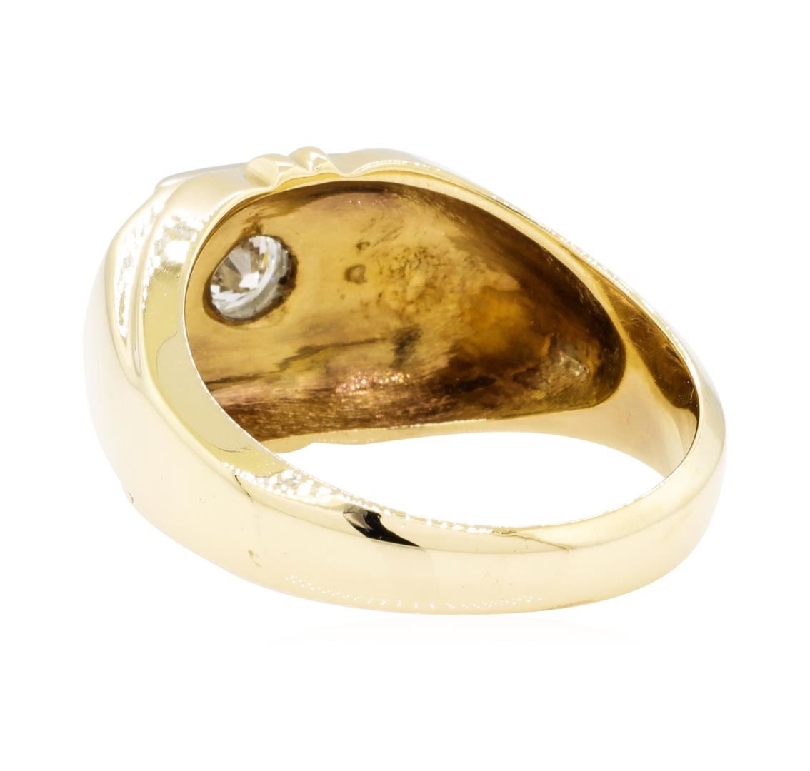 One electronically tested 14KT yellow and white gold man's combination cast & assembled fashion ring with a tapered shank with a bright polish finish. The featured man's ring has a shank measuring 3.80 millimeters wide. Identified with markings of '14K'. Condition is new, good workmanship. Containing: One prong set round brilliant cut diamond, measuring 4.60 - 4.55 x 2.60mm (depth est.) approximate weight of 0.35ct. Graded in the setting. Color H Clarity VS-1 Cut Good. Total Weight of Diamonds 0.35ct.. Total Weight of Ring 8.90gm. GAS Appraised.