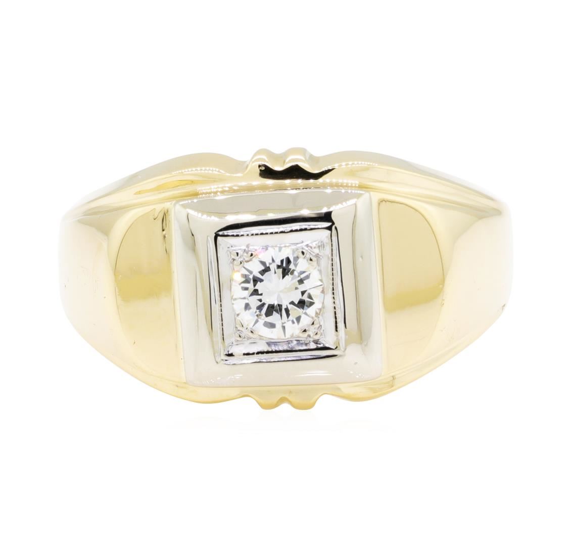 One electronically tested 14KT yellow and white gold man's combination cast & assembled fashion ring with a tapered shank with a bright polish finish. The featured man's ring has a shank measuring 3.80 millimeters wide. Identified with markings of '14K'. Condition is new, good workmanship. Containing: One prong set round brilliant cut diamond, measuring 4.60 - 4.55 x 2.60mm (depth est.) approximate weight of 0.35ct. Graded in the setting. Color H Clarity VS-1 Cut Good. Total Weight of Diamonds 0.35ct.. Total Weight of Ring 8.90gm. GAS Appraised.