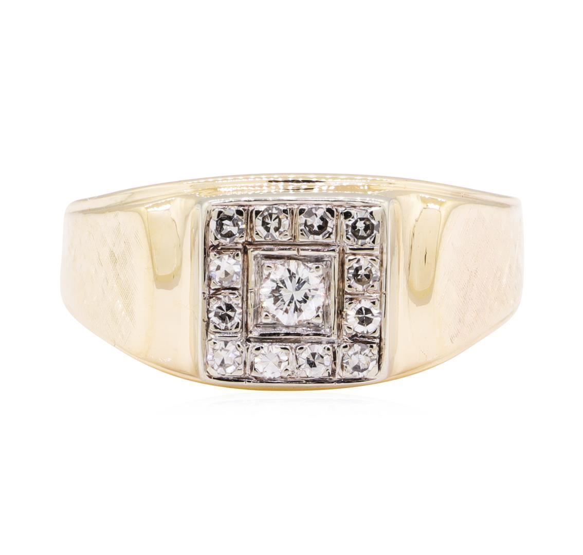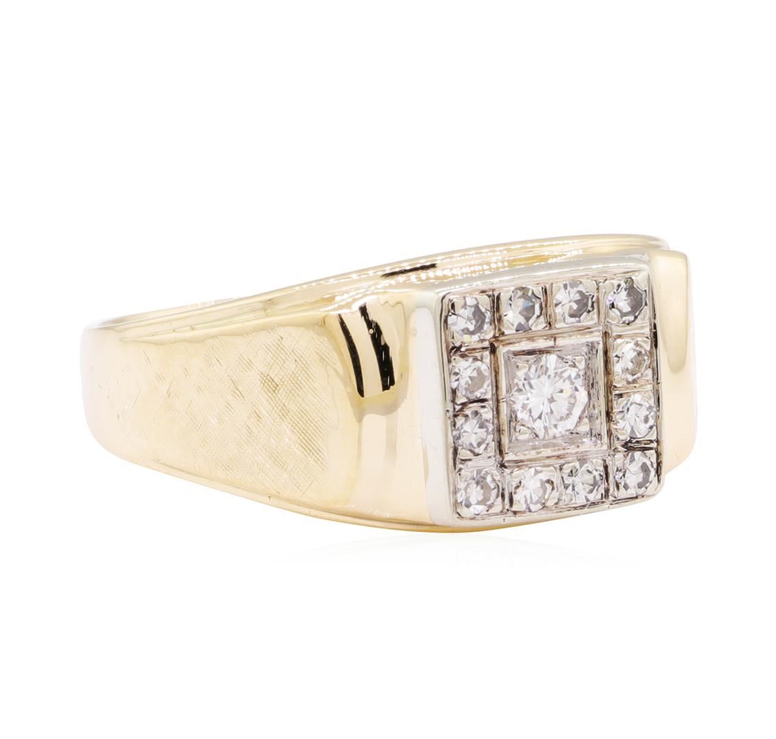 One square top Men's ring featuring: 14KT yellow and white gold weighing 7.8 grams containing diamonds weighing 0.50ctw. The ring is a size 12.5.