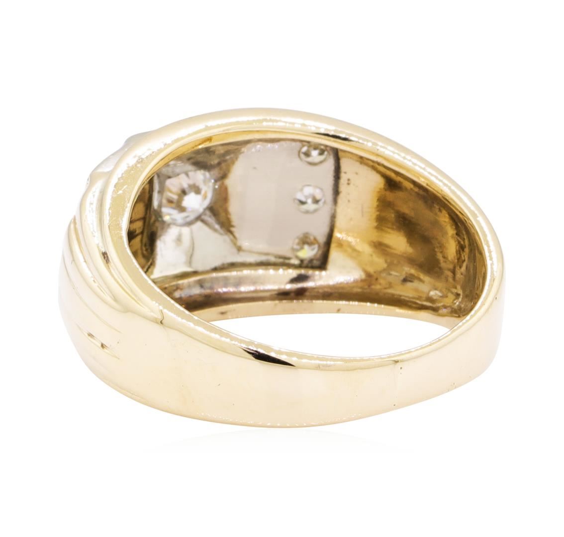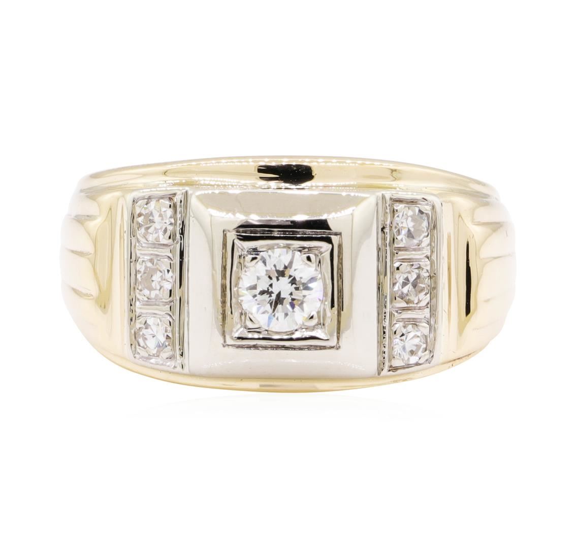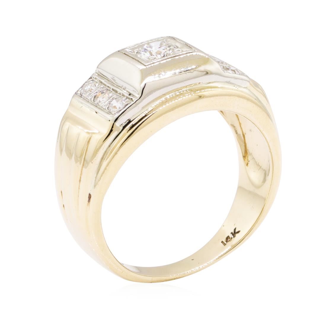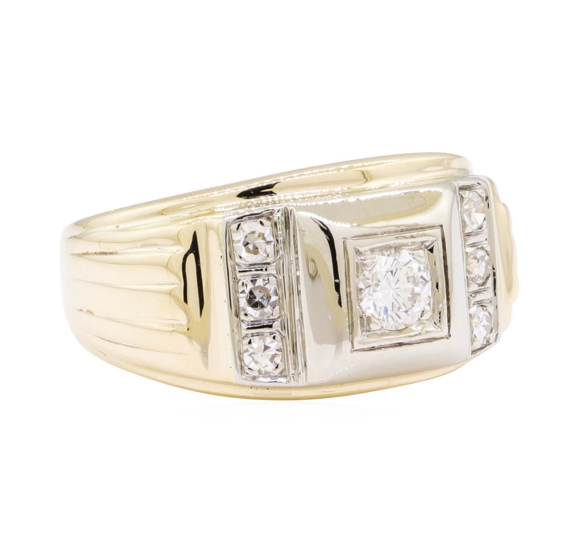 One square top mens ring featuring: 14KT yellow and white gold weighing 8.8 grams containing diamonds weighing 0.50ctw. The ring is a size 8.5.