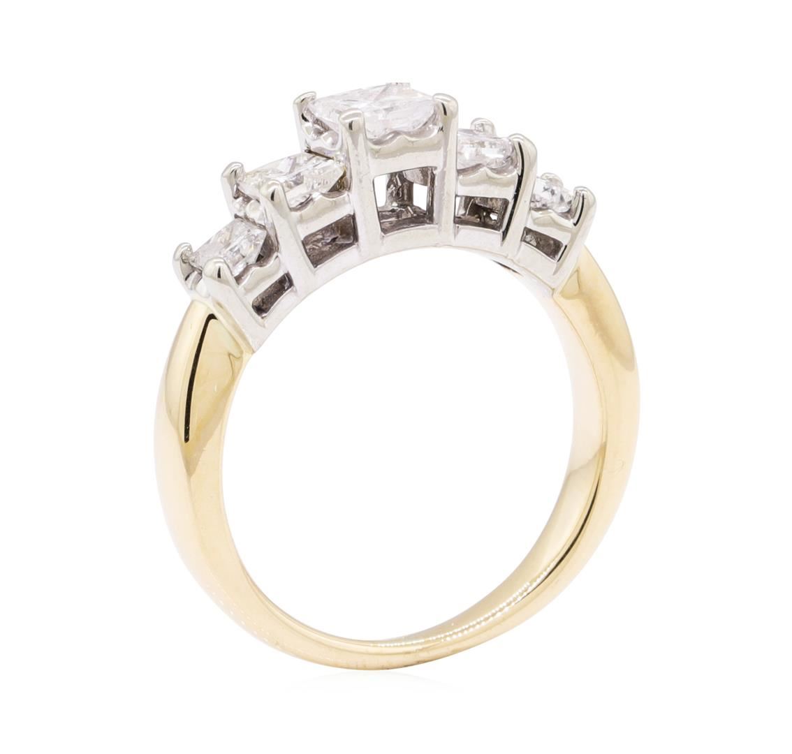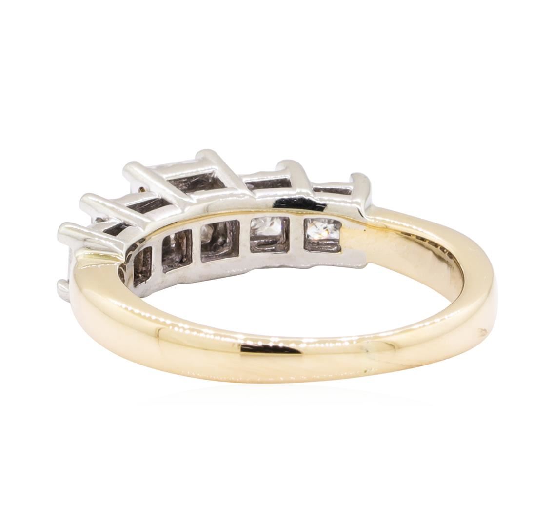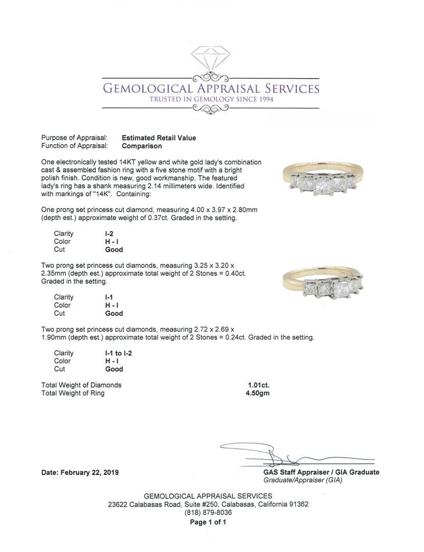 One electronically tested 14KT yellow and white gold lady's combination cast & assembled fashion ring with a five stone motif with a bright polish finish. The featured lady's ring has a shank measuring 2.14 millimeters wide. Identified with markings of '14K'. Condition is new, good workmanship. Containing: One prong set princess cut diamond, measuring 4.00 x 3.97 x 2.80mm (depth est.) approximate weight of 0.37ct. Graded in the setting. Color H - I, Clarity I-2, Cut Good Two prong set princess cut diamonds, measuring 3.25 x 3.20 x 2.35mm (depth est.) approximate total weight of 2 Stones = 0.40ct. Graded in the setting. Color H - I, Clarity I-1, Cut Good Two prong set princess cut diamonds, measuring 2.72 x 2.69 x 1.90mm (depth est.) approximate total weight of 2 Stones = 0.24ct. Graded in the setting. Color H - I, Clarity I-1 to I-2, Cut Good. Total Weight of Diamonds 1.01ct. Total Weight of Ring 4.50gm. GAS Appraised.