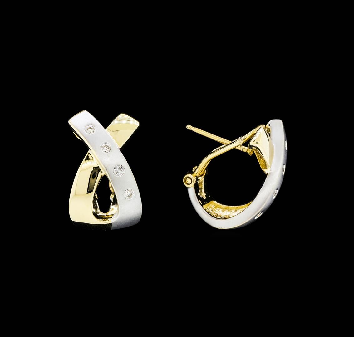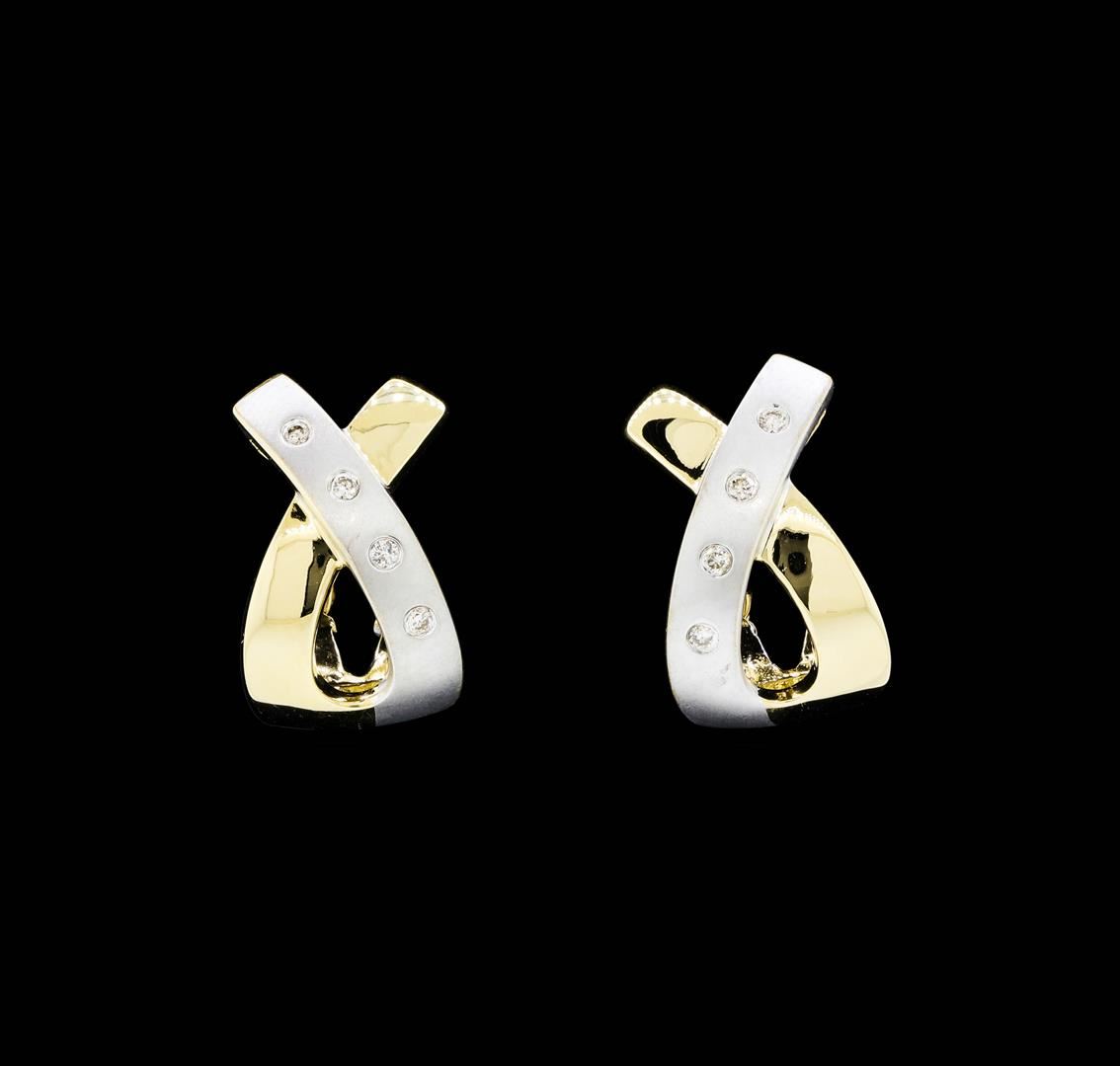 One pair of Ladies earrings with omega backs with posts featuring: 14KT yellow and white gold weighing 7.5 grams containing diamonds weighing 0.20ctw.