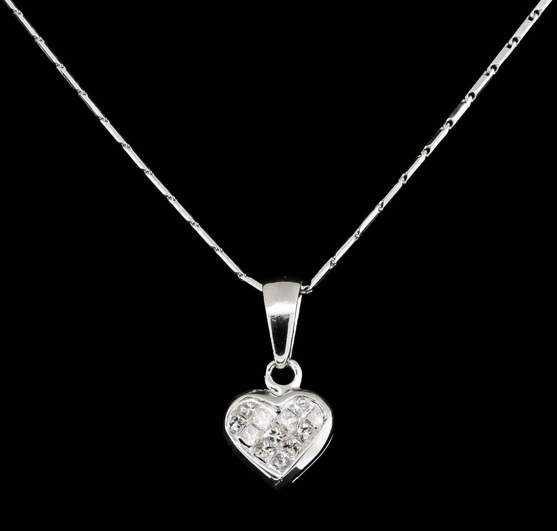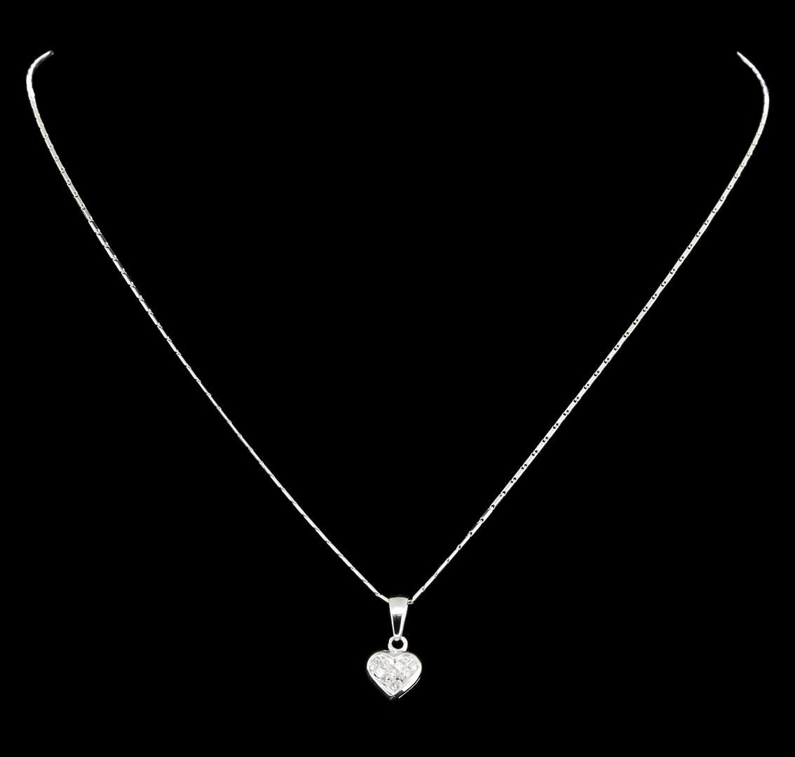 One Ladies pendant and chain featuring: 14KT white gold chain measuring 18 inches long weighing 1.7 grams and an 18KT white gold pendant weighing 1.2 grams containing diamonds weighing 0.25ctw.