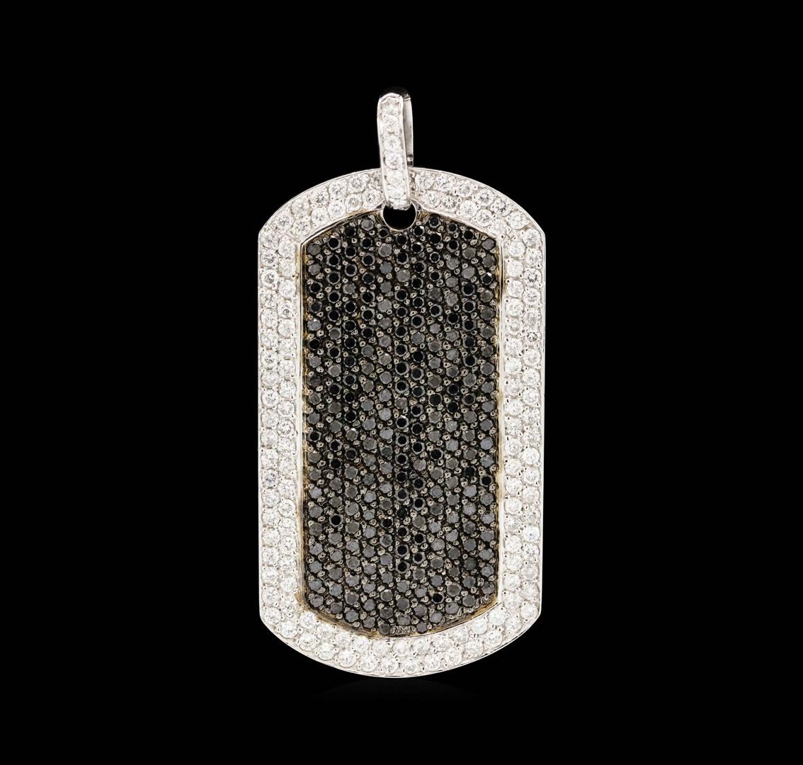 One electronically tested 14KT white & black rhodium plated gold lady's combination cast & assembled fashion dog tag pendant with a bright polish finish. The pendant has a drop of approximately 58 millimeters. Identified with markings of "14K". Condition is new, good workmanship. Containing: Two Hundred Forty round brilliant cut treated diamonds, measuring 1.60 - 1.50 x 0.96mm (depth est.) approximate total weight of 240 Stones = 3.40ct. Colored gemstones are presumed to have been subjected to commonly used enhancement processes. Graded in the setting. Color Fancy Black One Hundred Twenty-Four prong set round brilliant cut diamonds, measuring 1.75 - 1.70 x 1.07mm (depth est.) approximate total weight of 124 Stones = 2.40ct. Graded in the setting. Color H - I Clarity SI-1 to I-1 Cut Good. Total Weight of Diamonds 5.80ct. Total Weight of Pendant 14.80gm. GAS Appraised.