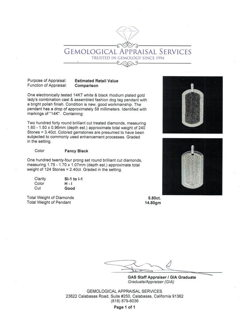One electronically tested 14KT white & black rhodium plated gold lady's combination cast & assembled fashion dog tag pendant with a bright polish finish. The pendant has a drop of approximately 58 millimeters. Identified with markings of "14K". Condition is new, good workmanship. Containing: Two Hundred Forty round brilliant cut treated diamonds, measuring 1.60 - 1.50 x 0.96mm (depth est.) approximate total weight of 240 Stones = 3.40ct. Colored gemstones are presumed to have been subjected to commonly used enhancement processes. Graded in the setting. Color Fancy Black One Hundred Twenty-Four prong set round brilliant cut diamonds, measuring 1.75 - 1.70 x 1.07mm (depth est.) approximate total weight of 124 Stones = 2.40ct. Graded in the setting. Color H - I Clarity SI-1 to I-1 Cut Good. Total Weight of Diamonds 5.80ct. Total Weight of Pendant 14.80gm. GAS Appraised.