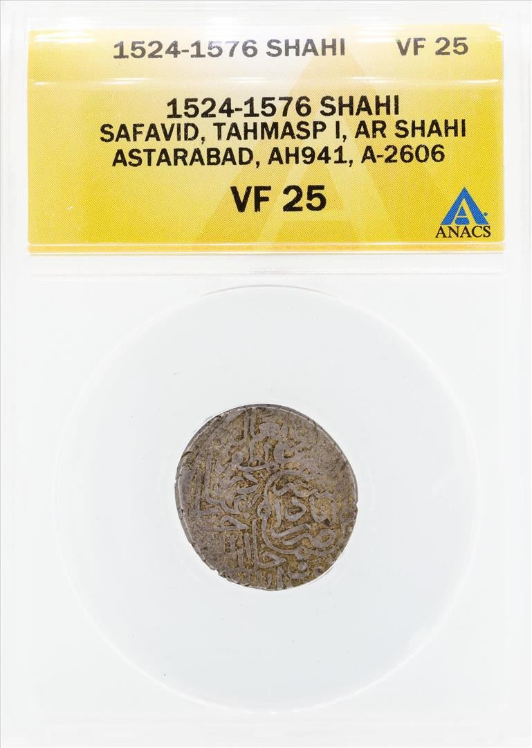 One 1524-1576 Shahi Safavid Tahmasp I AR Shahi Astarabad Coin ANACS VF25. ANACS Certified.