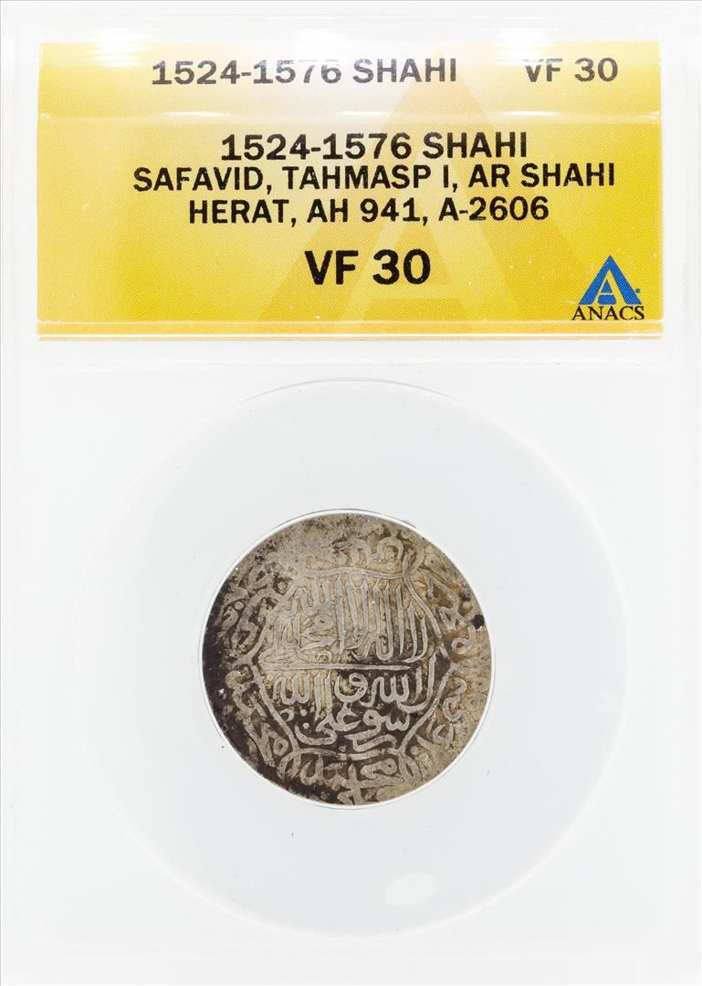 One 1524-1576 Shahi Safavid Tahmasp I AR Shahi Herat Coin ANACS VF30. ANACS Certified.