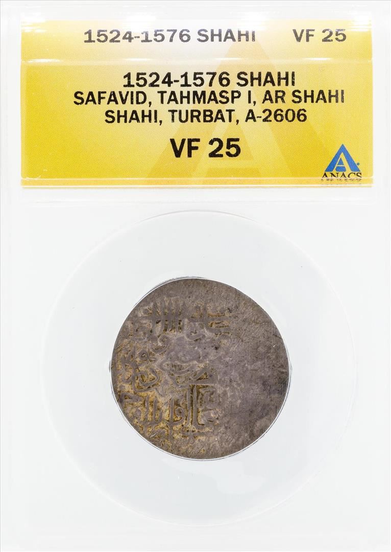 One 1524-1576 Shahi Safavid Tahmasp I AR Shahi Shahi Turbat Coin ANACS VF25. ANACS Certified.