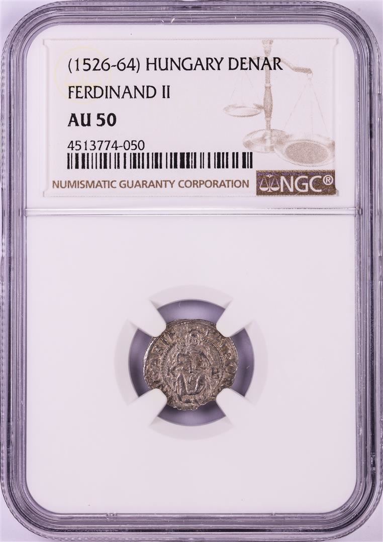 One 1526-64 Ferdinand II Hungary Denar 'Madonna and Child' Coin NGC AU50. NGC Certified.
