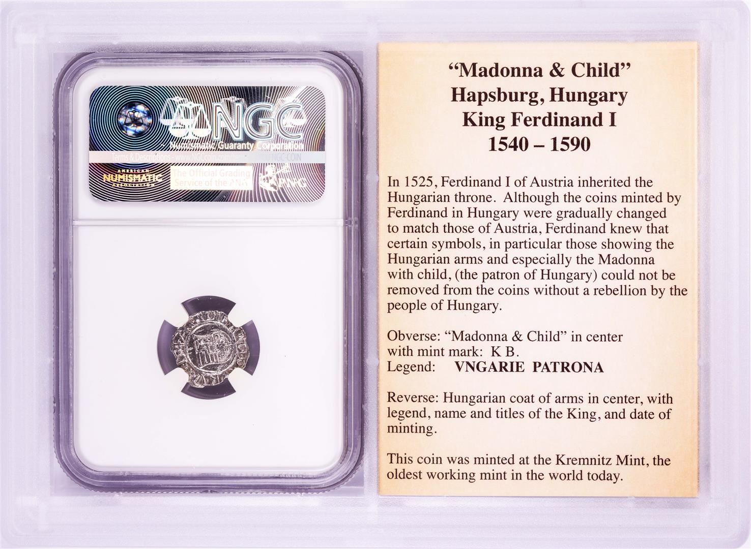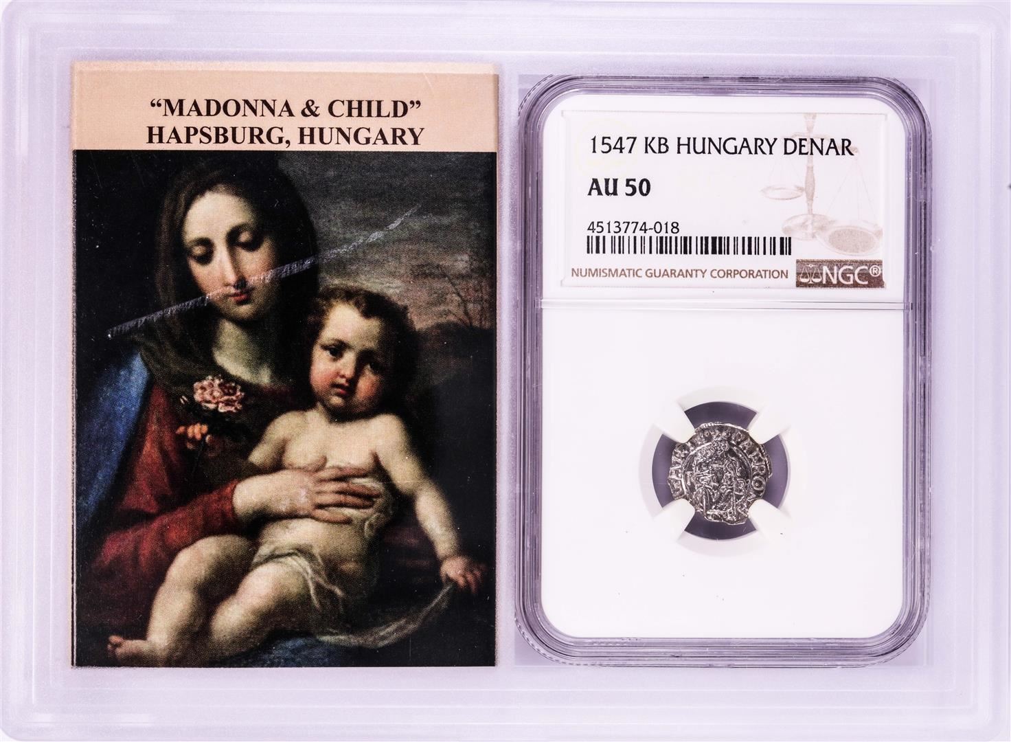 One 1547 KB Hungary Denar 'Madonna and Child' Coin NGC AU50 w/ Story Box. NGC Certified.