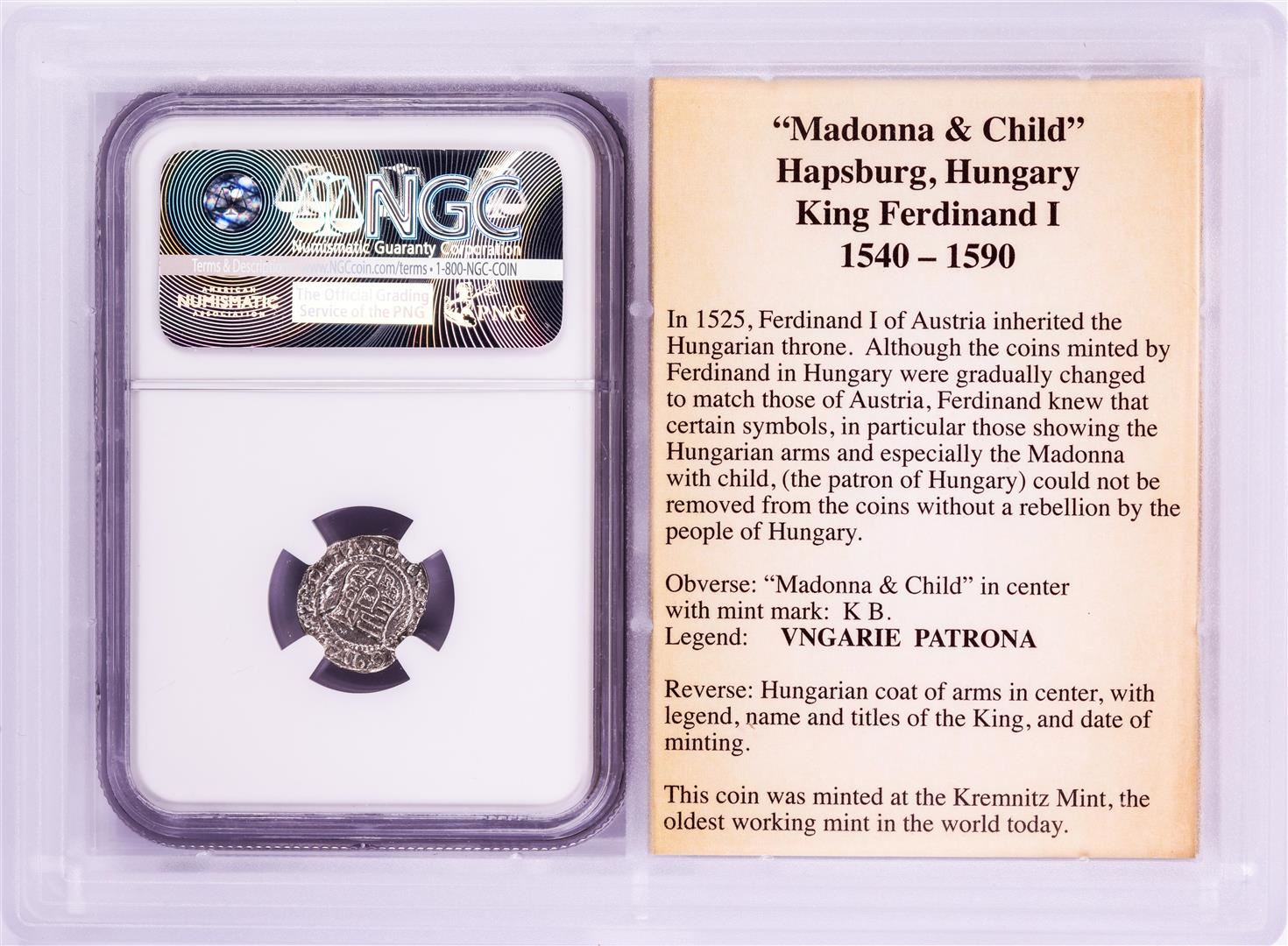 One 1549 KB Hungary Denar 'Madonna and Child' Coin NGC MS62 w/ Story Box. NGC Certified.