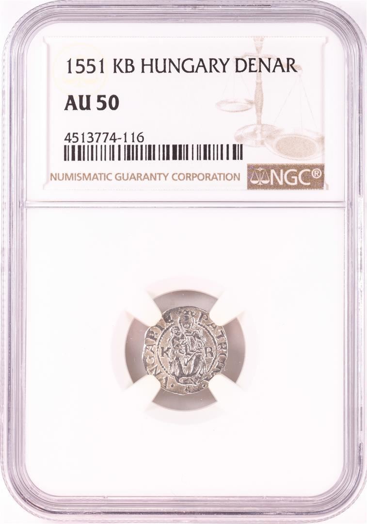 One 1551 KB Hungary Denar 'Madonna and Child' Coin NGC AU50. NGC Certified.