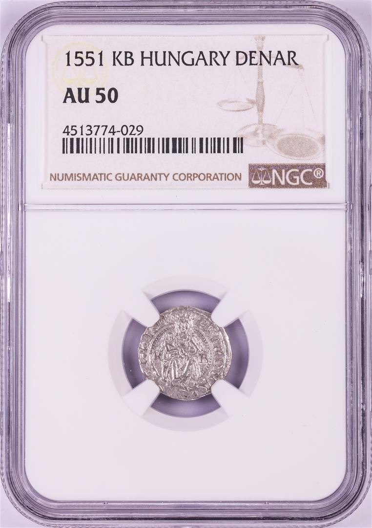 One 1551 KB Hungary Denar 'Madonna and Child' Coin NGC AU50. NGC Certified.