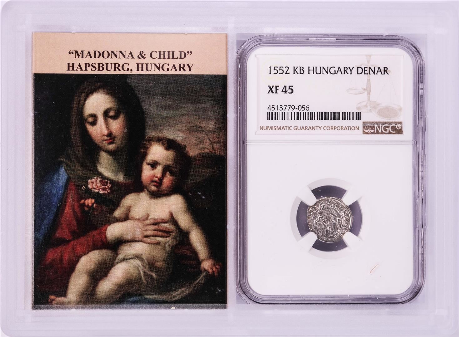 One 1552 KB Hungary Denar 'Madonna and Child' Coin NGC XF45 w/ Story Box. NGC Certified.
