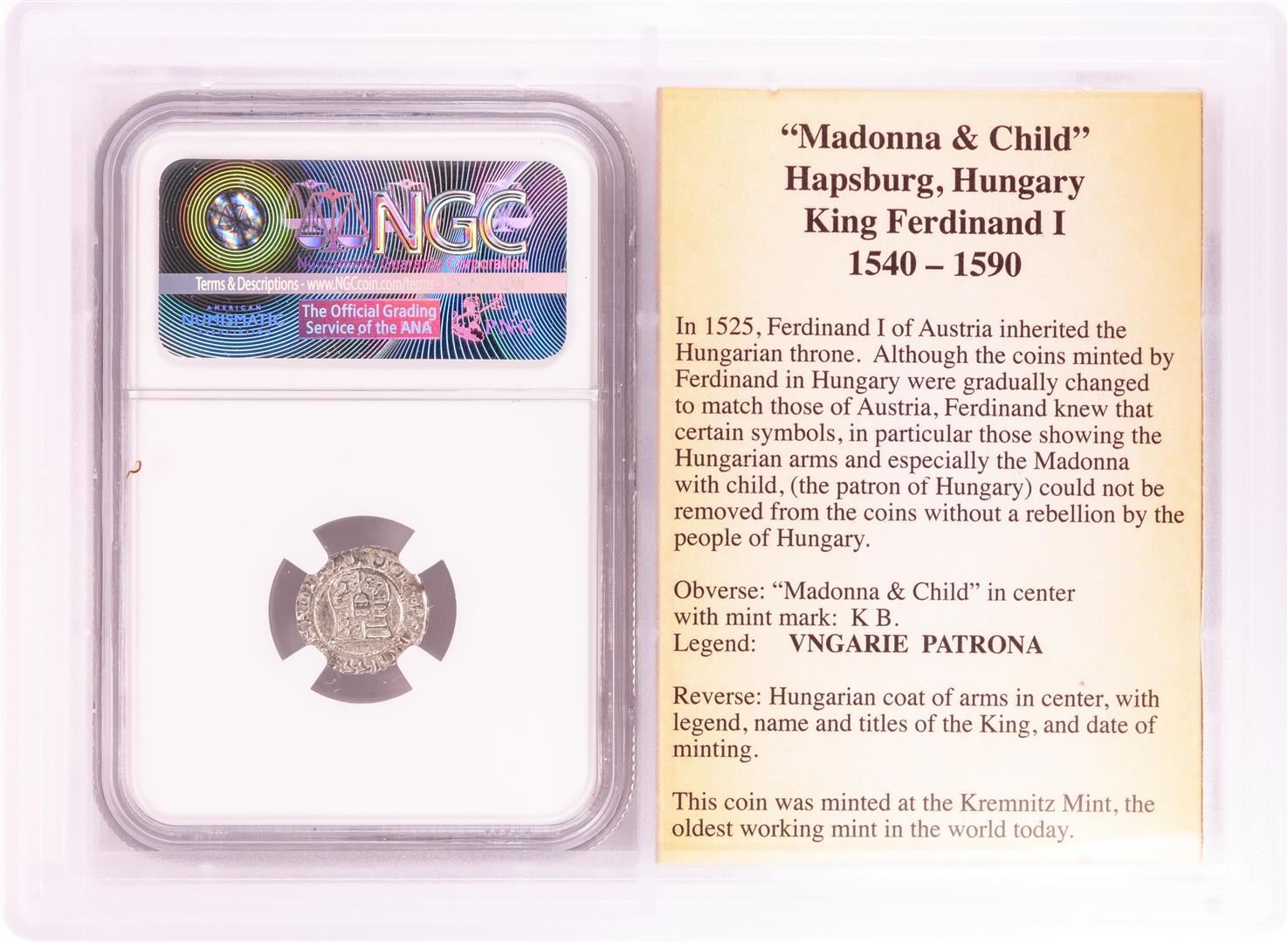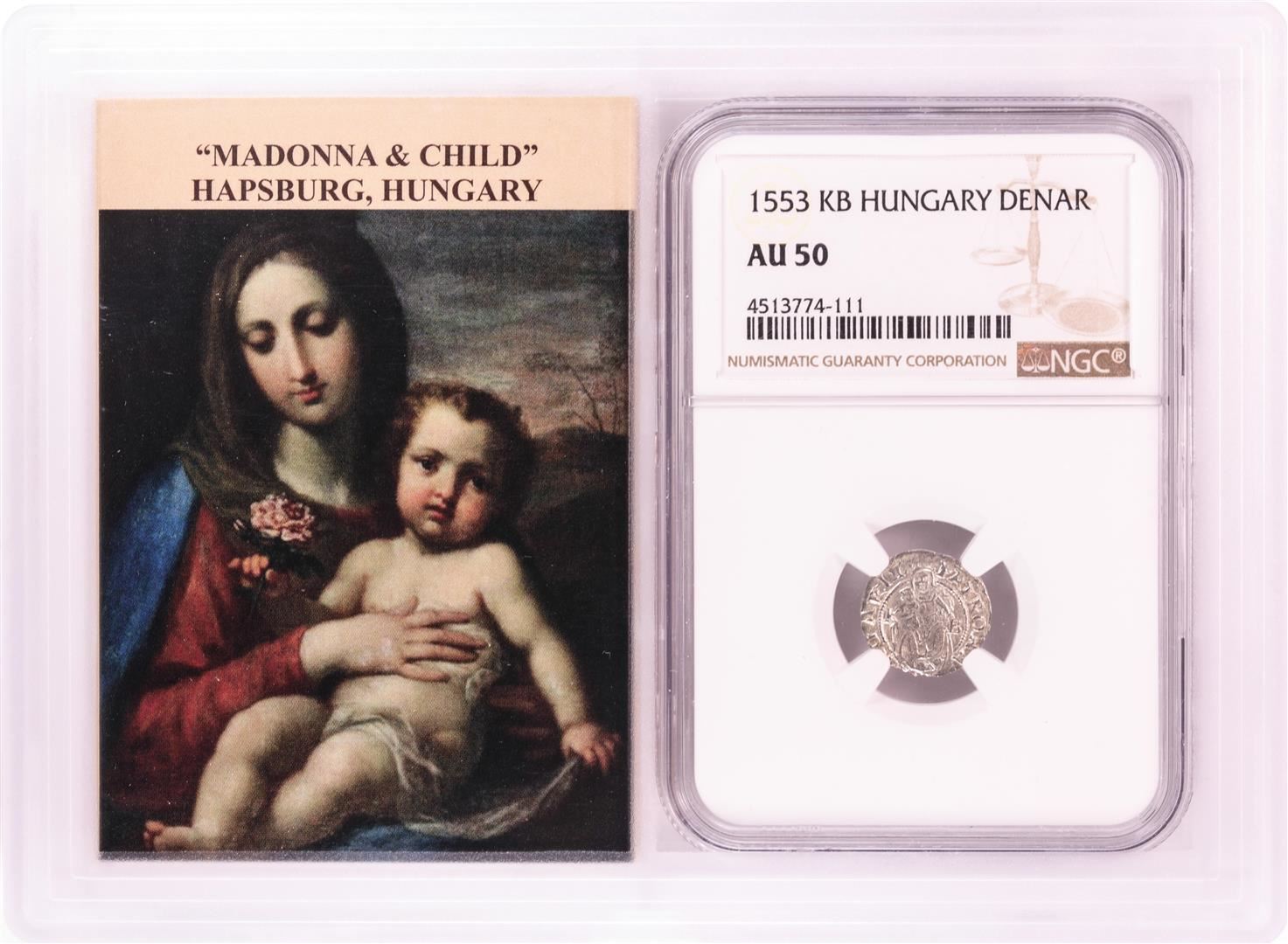 One 1553 KB Hungary Denar 'Madonna and Child' Coin NGC AU50 w/ Story Box. NGC Certified.