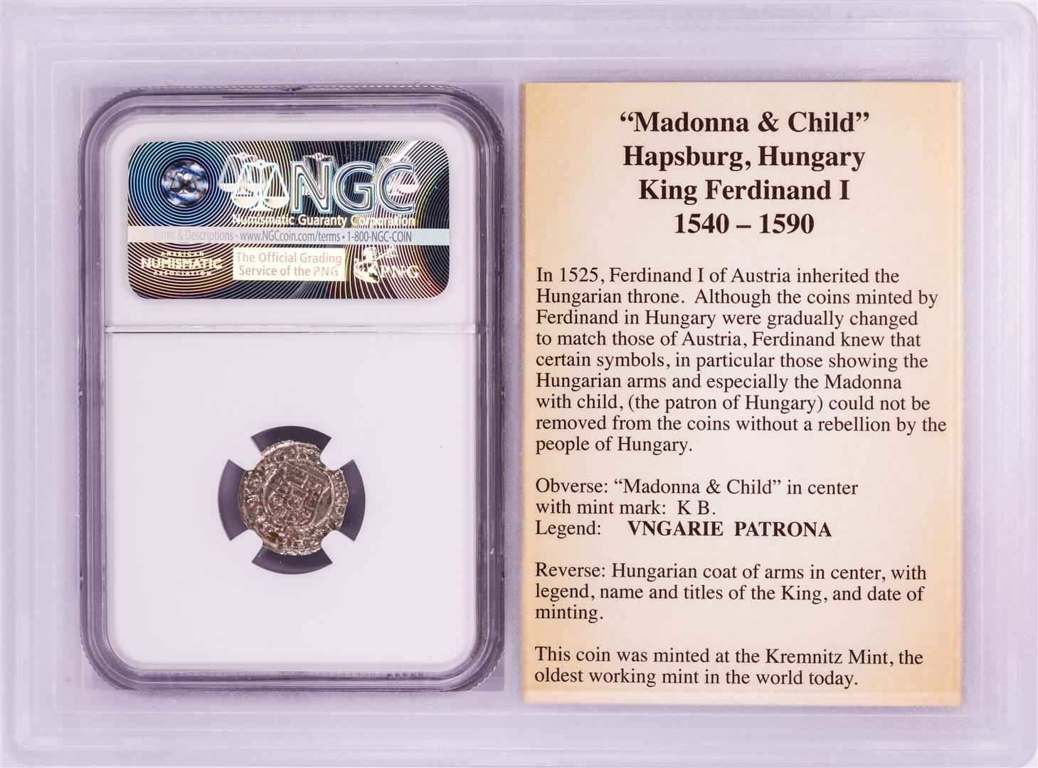 One 1555 KB Hungary Denar 'Madonna and Child' Coin NGC AU58 w/ Story Box. NGC Certified.