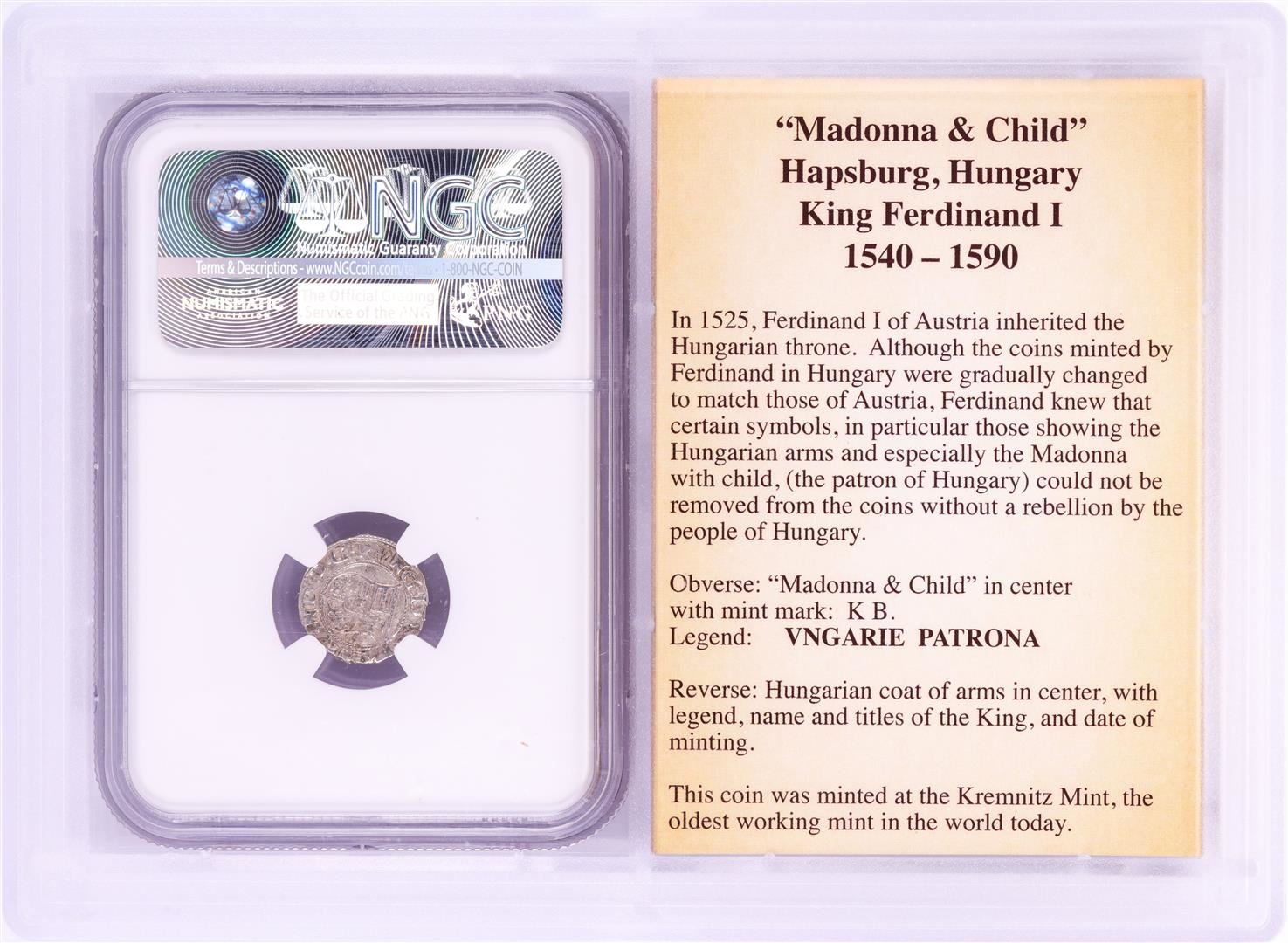 One 1555 KB Hungary Denar 'Madonna and Child' Coin NGC XF40 w/ Story Box. NGC Certified.