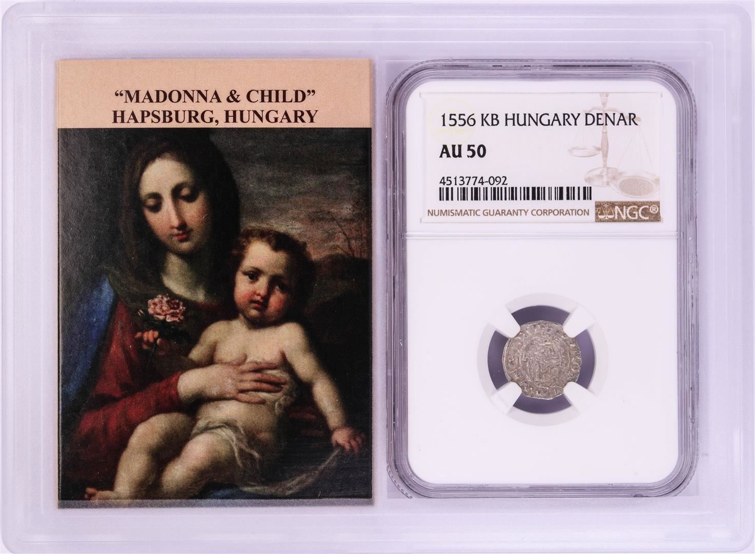1556 KB Hungary Denar 'Madonna and Child' Coin NGC AU50 w/ Story Box