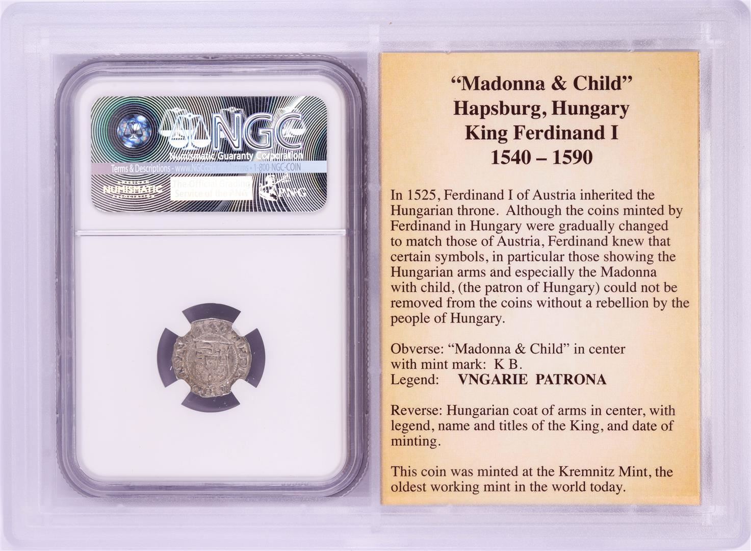 One 1556 KB Hungary Denar 'Madonna and Child' Coin NGC AU50 w/ Story Box. NGC Certified.