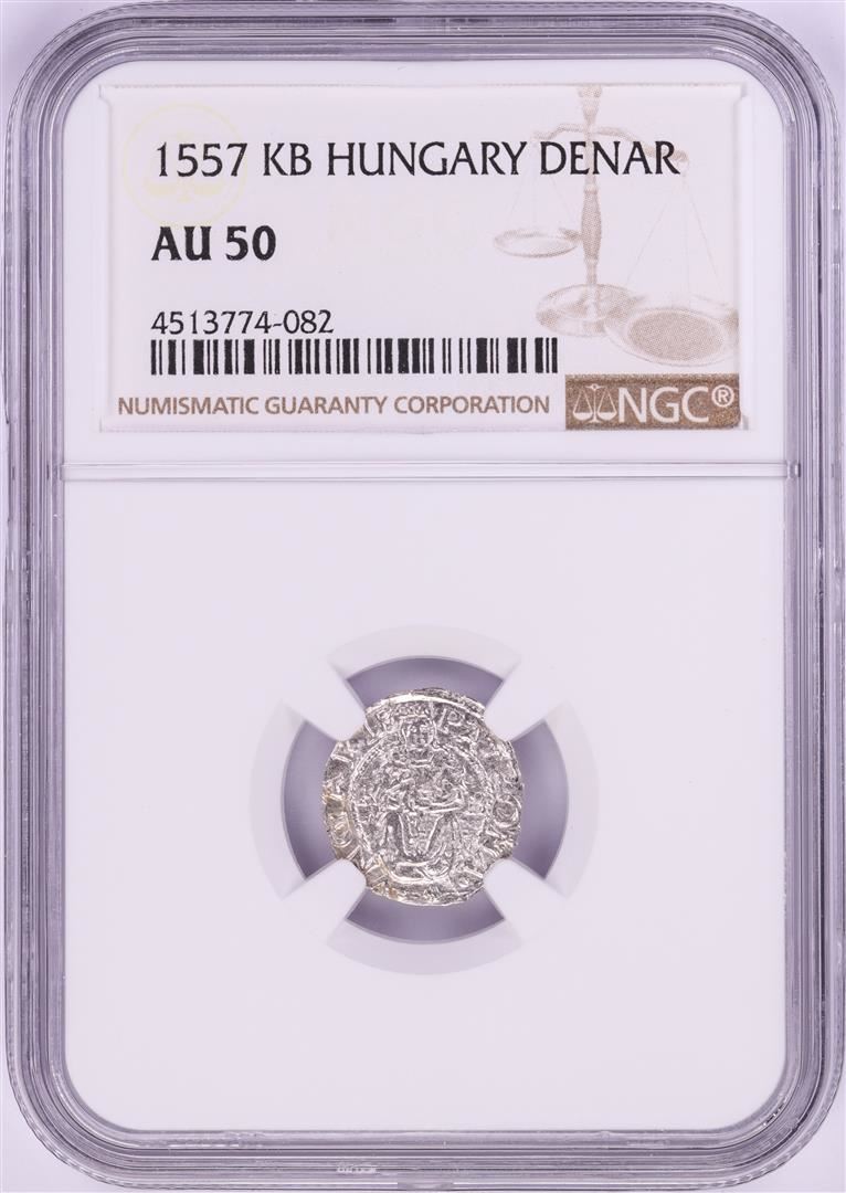 One 1557 KB Hungary Denar 'Madonna and Child' Coin NGC AU50. NGC Certified.