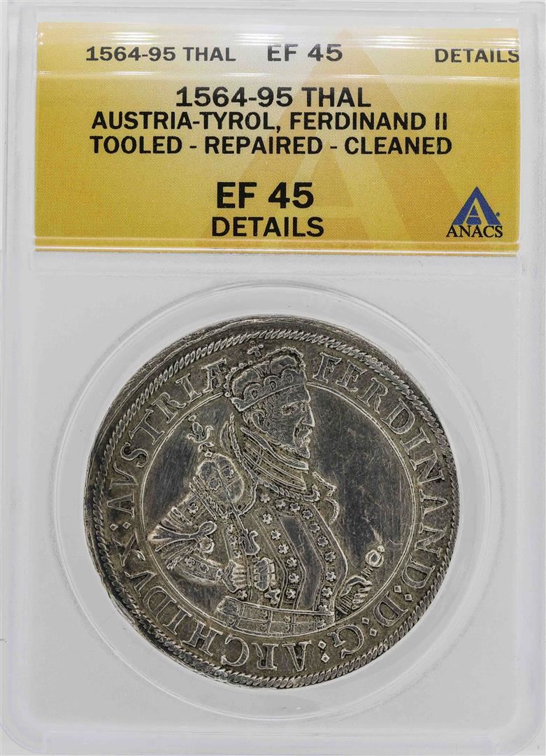 One 1564-1595 Austria-Tyrol Ferdinand II Thaler Coin ANACS XF45 Details. ANACS Certified.