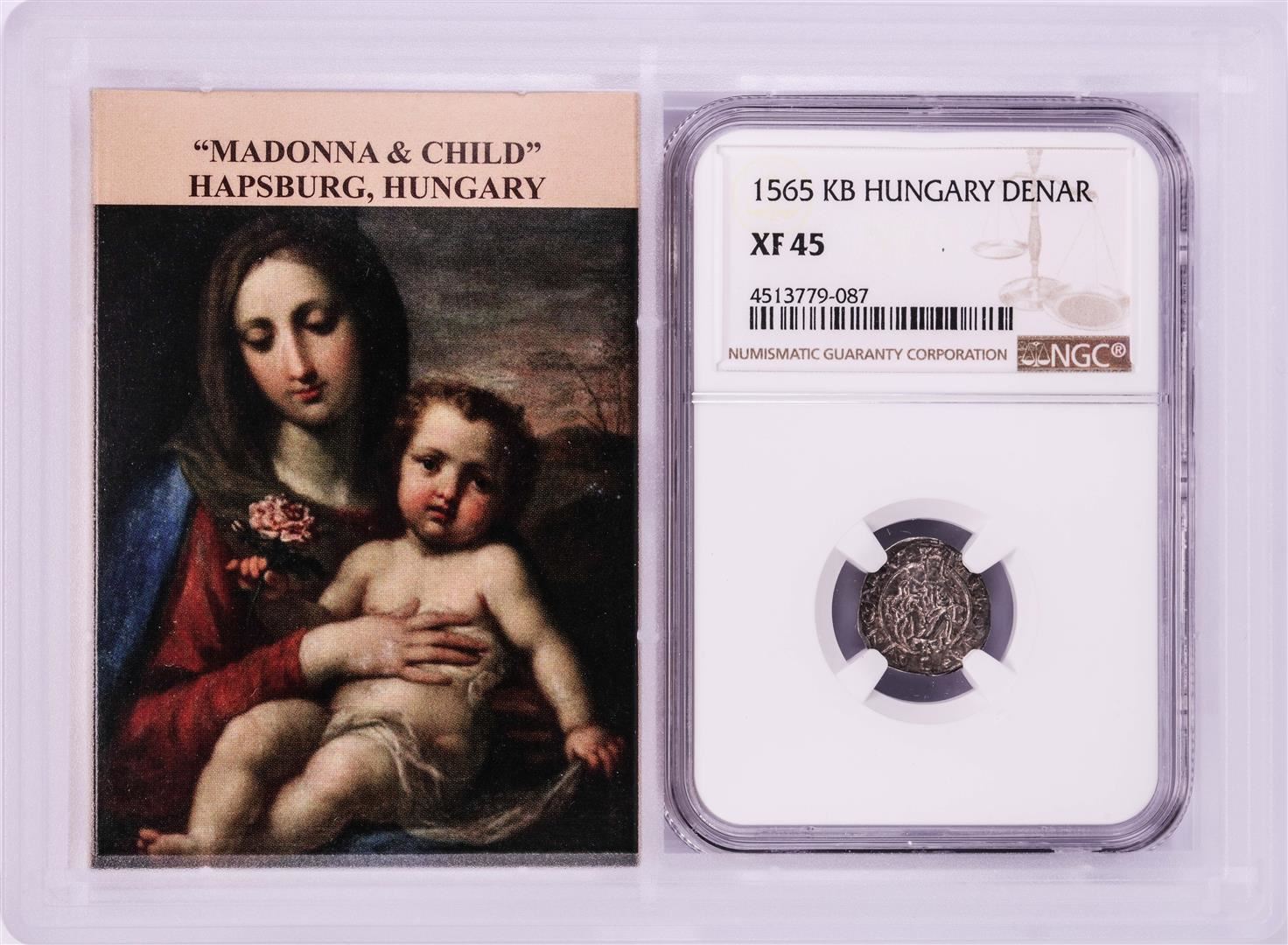 One 1565 KB Hungary Denar 'Madonna and Child' Coin NGC XF45 w/ Story Box. NGC Certified.